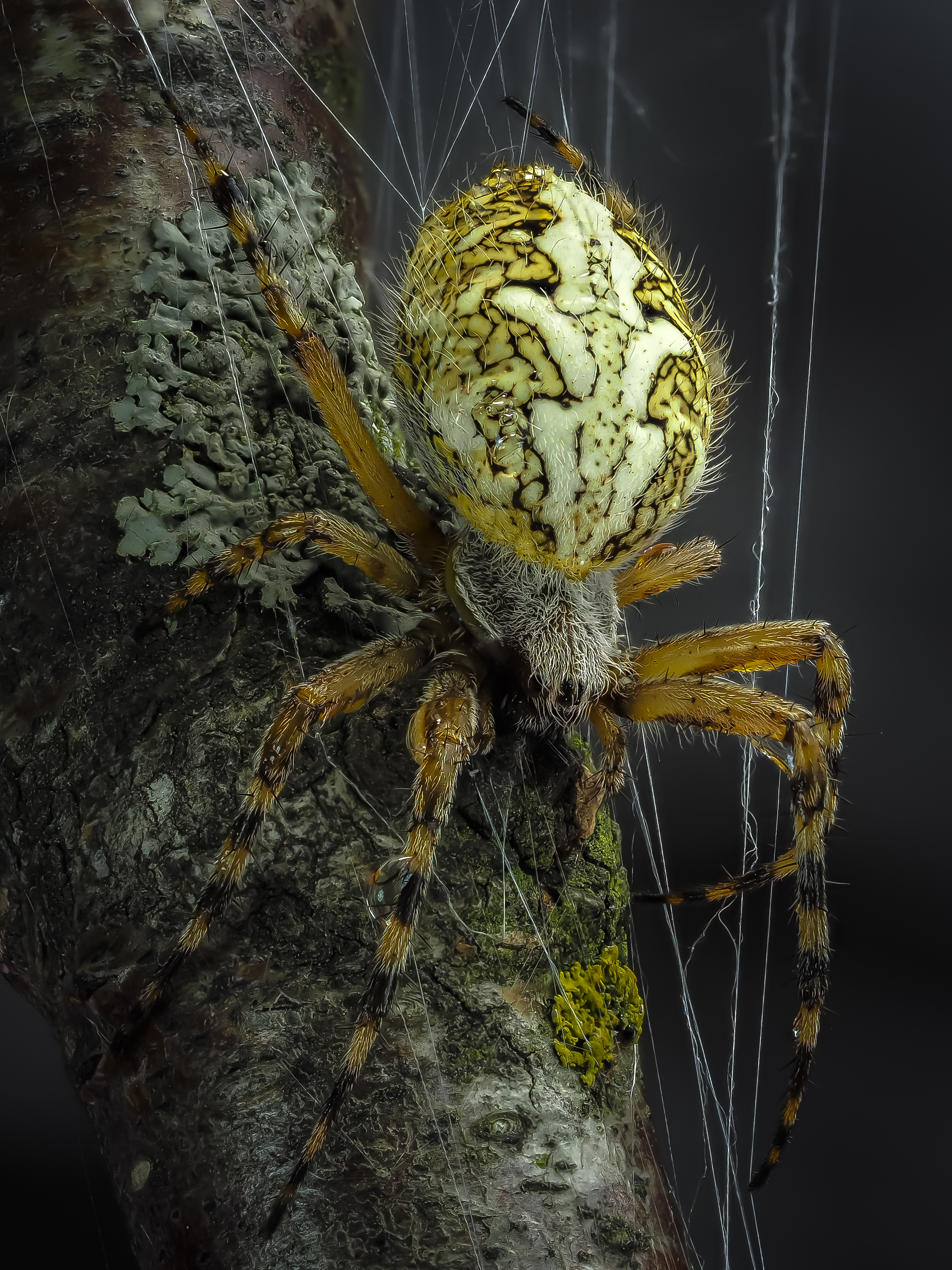 На снимке запечатлён крупный паук, вероятно, из рода Argiope, в своей естественной среде — на ветке, покрытой лишайниками и мхом. Его ярко окрашенное брюшко с чётким узором контрастирует с тёмной корой. Тонкие нити паутины, пересекающие кадр, создают ощущение живой экосистемы. Фотография передаёт тонкую балансировку между хищником и его убежищем, подчёркивая красоту и уязвимость природы. Работа Олега Савицкого демонстрирует мастерство макросъёмки и внимание к деталям.