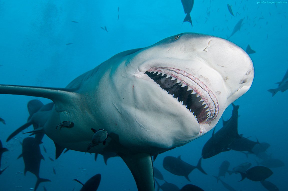 Ну это тревожный какой-то вариант ^_^ Гроза, молния, темно и страшно. Нет, там все-таки тропики, все такое, веселое, как морда у акулы ^_^ Это в Кейптаунской клетке ужас и кошмар, а бычьи акулы они все на кураже! ^_^