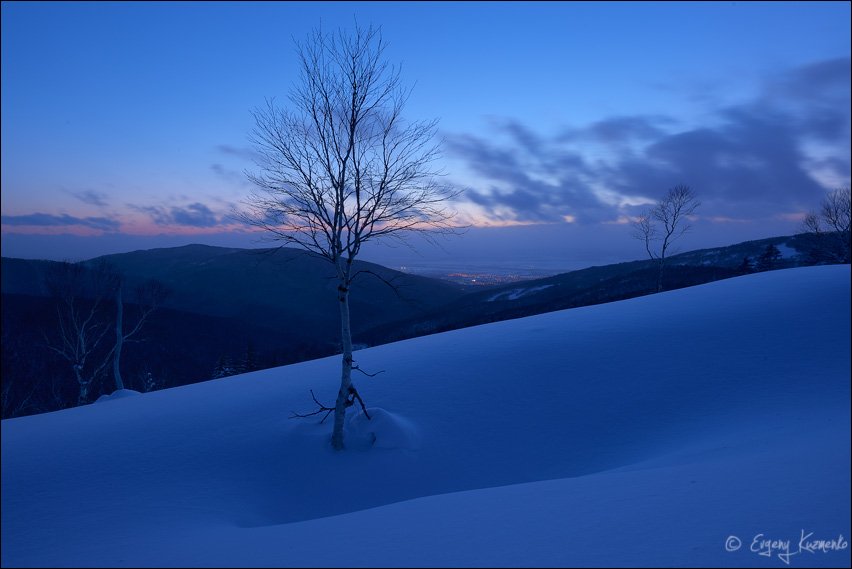 Вечерние сумерки на "Бамбучках" - склоне неподалеку от г. Российская. Сам склон покрыт зарослями курильского бамбука, отсюда и название. На заднем плане можно разглядеть огни ночного Южно-Сахалинска