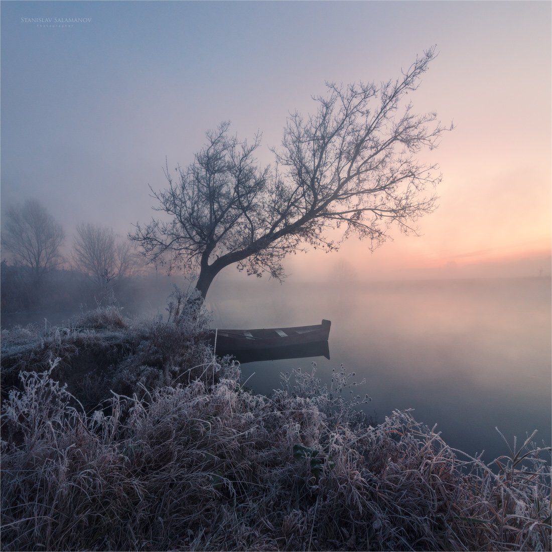 утро, туман, река, заморозок, иней, рассвет, лодка, дерево, зарево, свет, цвет, пейзаж, Станислав Саламанов