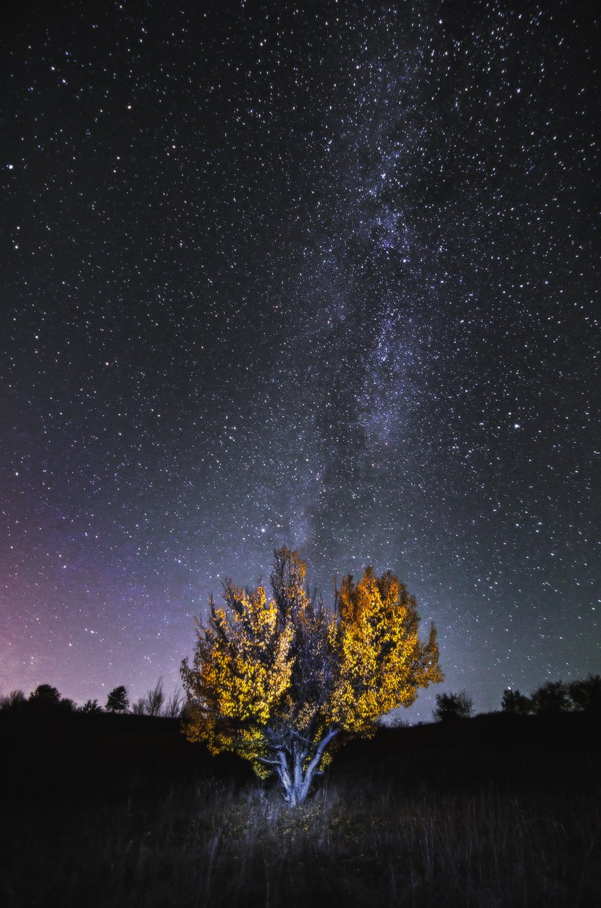 ночь, звезды, млечный путь, дерево, осень, желтые листья, сезон, природа, пейзаж, астрофото, Станислав Саламанов