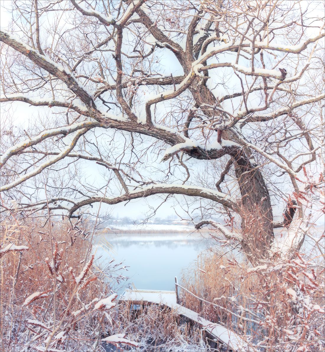 утро, снег, река, рассвет, мороз, зима, пейзаж, дерево, мостик, Станислав Саламанов