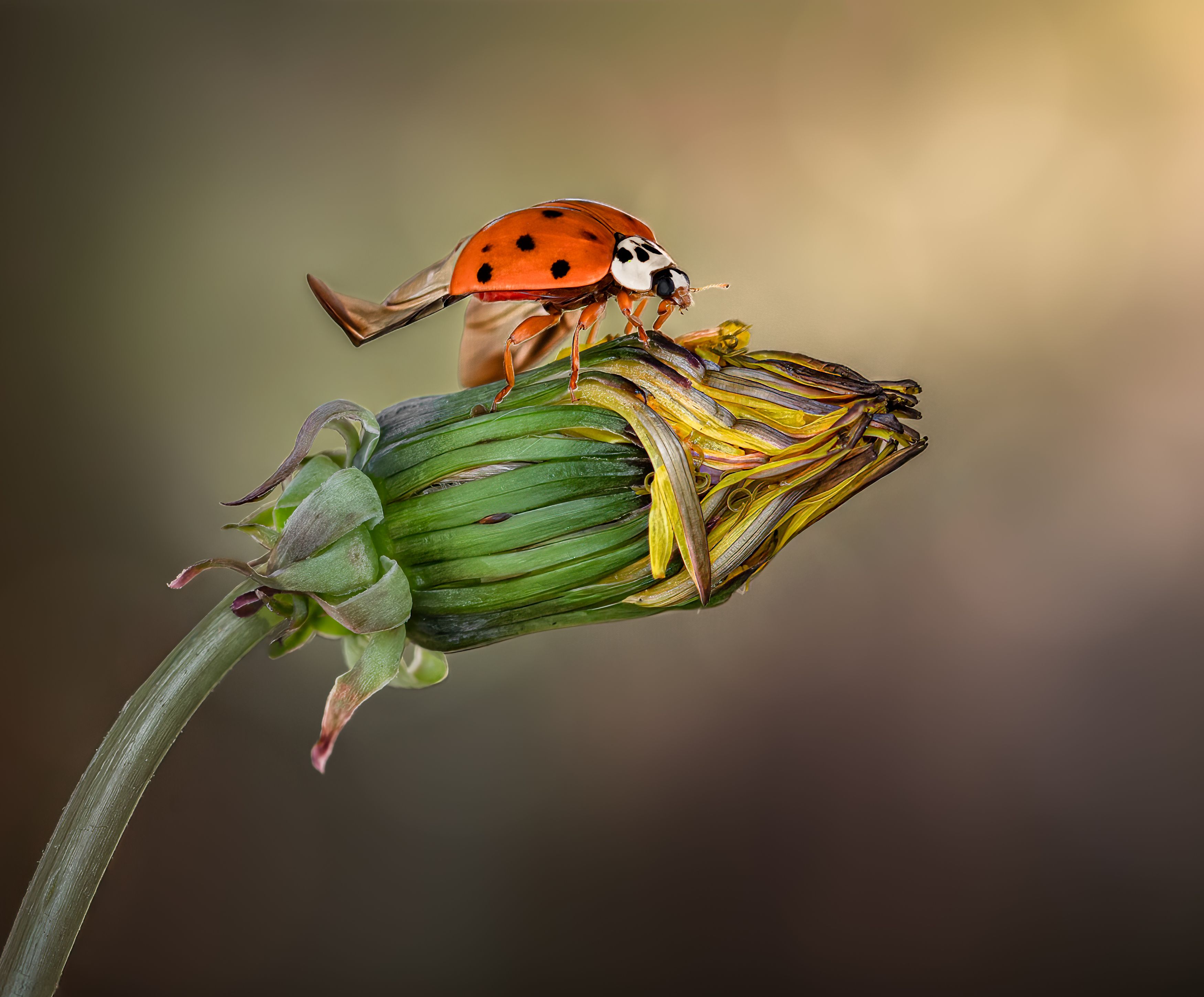 Good macro work—ladybug poised on a wilting bud, wings half-extended, like it’s just about to leave. The soft background lets the subject stand out without being overly dramatic.