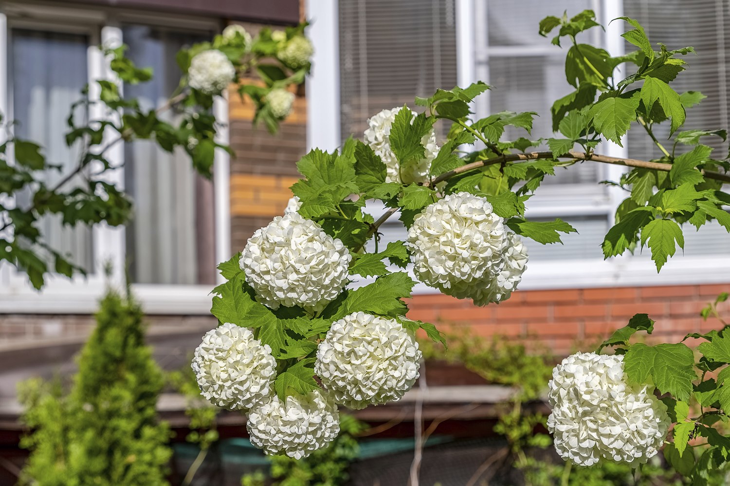 Калина 'Бульденеж'. Boule de neige в переводе с французского означает «снежный шар». Это чудесное растение на самом деле декоративная форма калины обыкновенной (Viburnum opulus), создание которой приписывают легендарному французскому селекционеру Виктору Лемуану