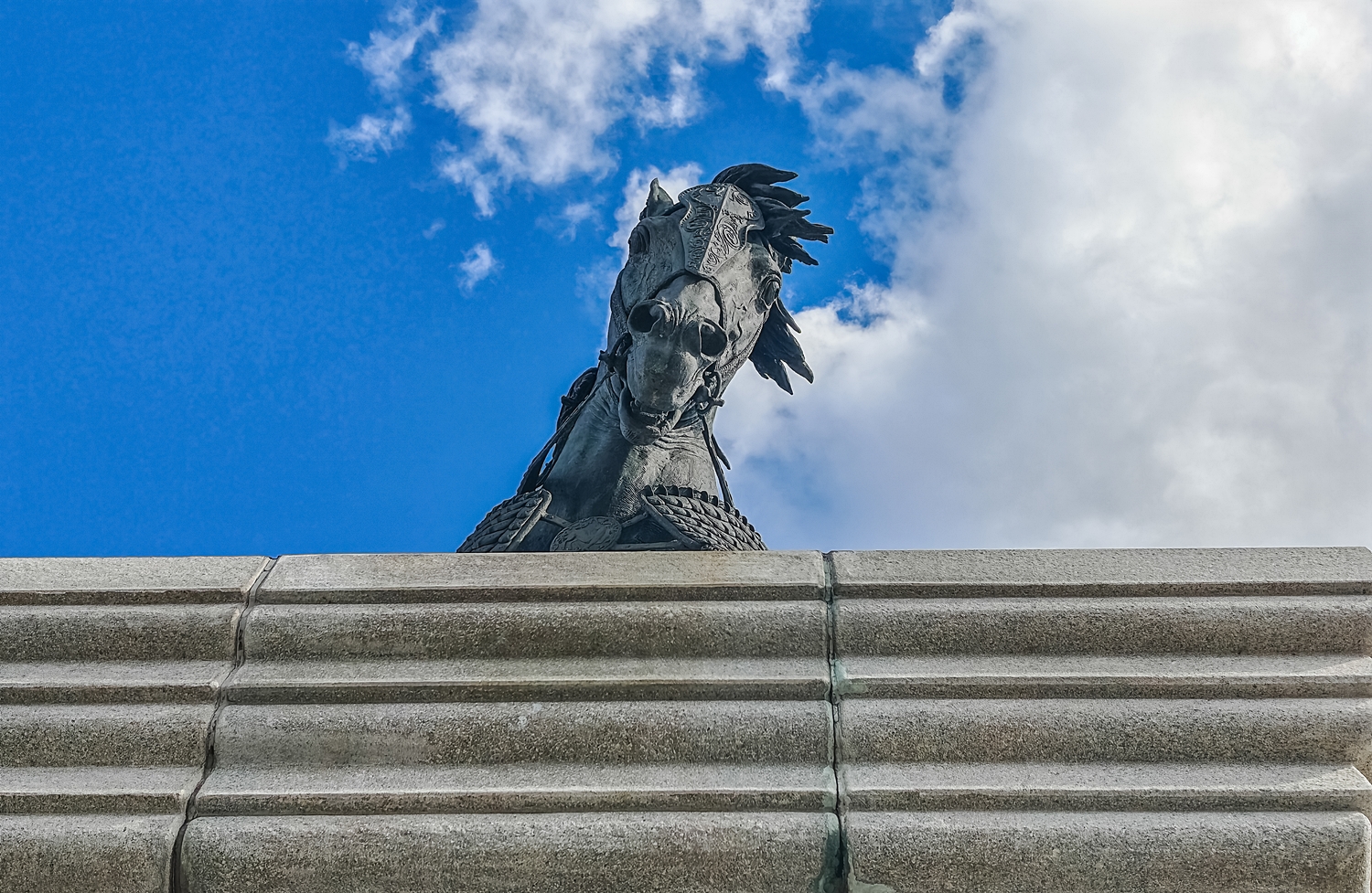 Памятник святому благоверному князю Дмитрию Донскому установлен у стены Коломенского кремля, возле прясла стены между Маринкиной и Грановитой башнями.
