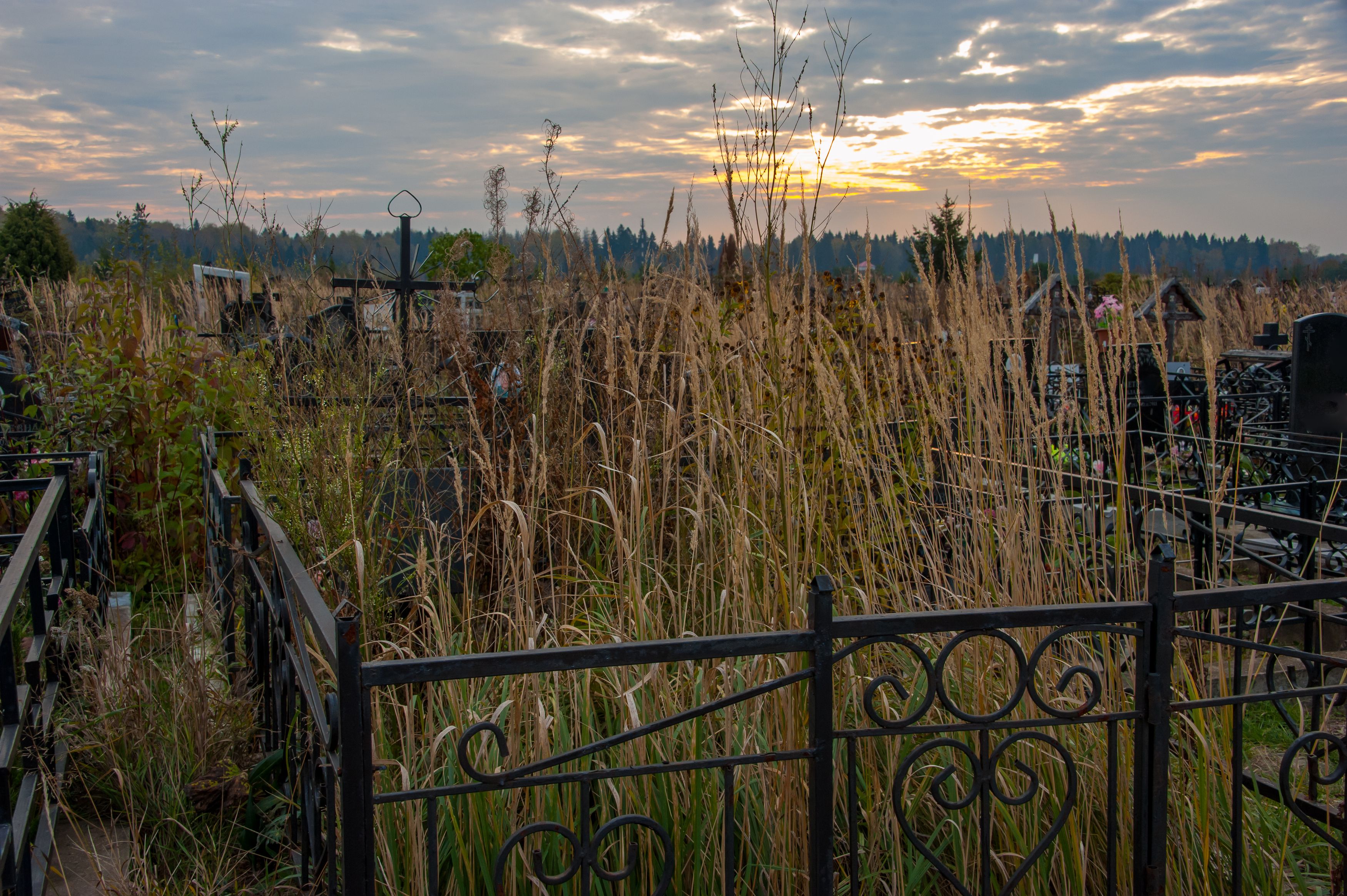 Моим предкам повезло больше: деревенское кладбище у нас в сосновом бору, мох, ландыши и белые растут. А Кузьминское кладбище - очень культурное и не заброшенное совсем.
