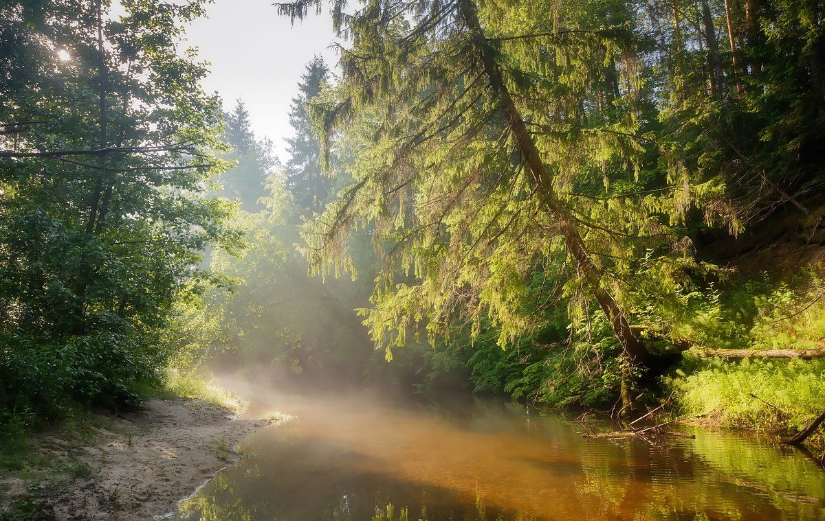 саров, сатис, пейзаж, вода, дерево, лето, лучь, отмель, песок, прозрачная, река, солнечный, тихое, туман, утро, Александр Чибиркин