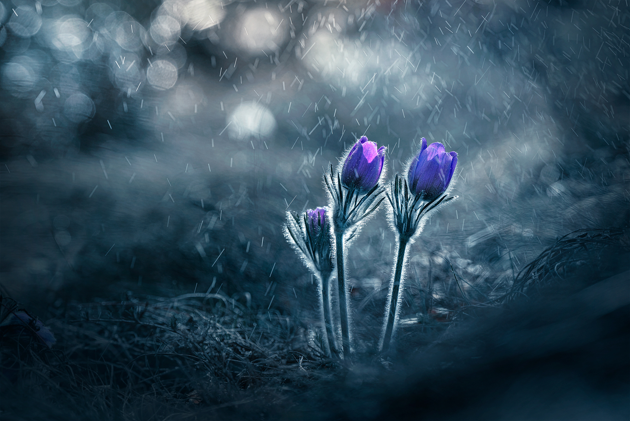 Three purple crocuses rise from dark, frosty ground, their delicate buds standing out against a soft, blurred background of falling snow. A quiet moment in nature, rendered with cool tones and gentle focus. 🌸❄️