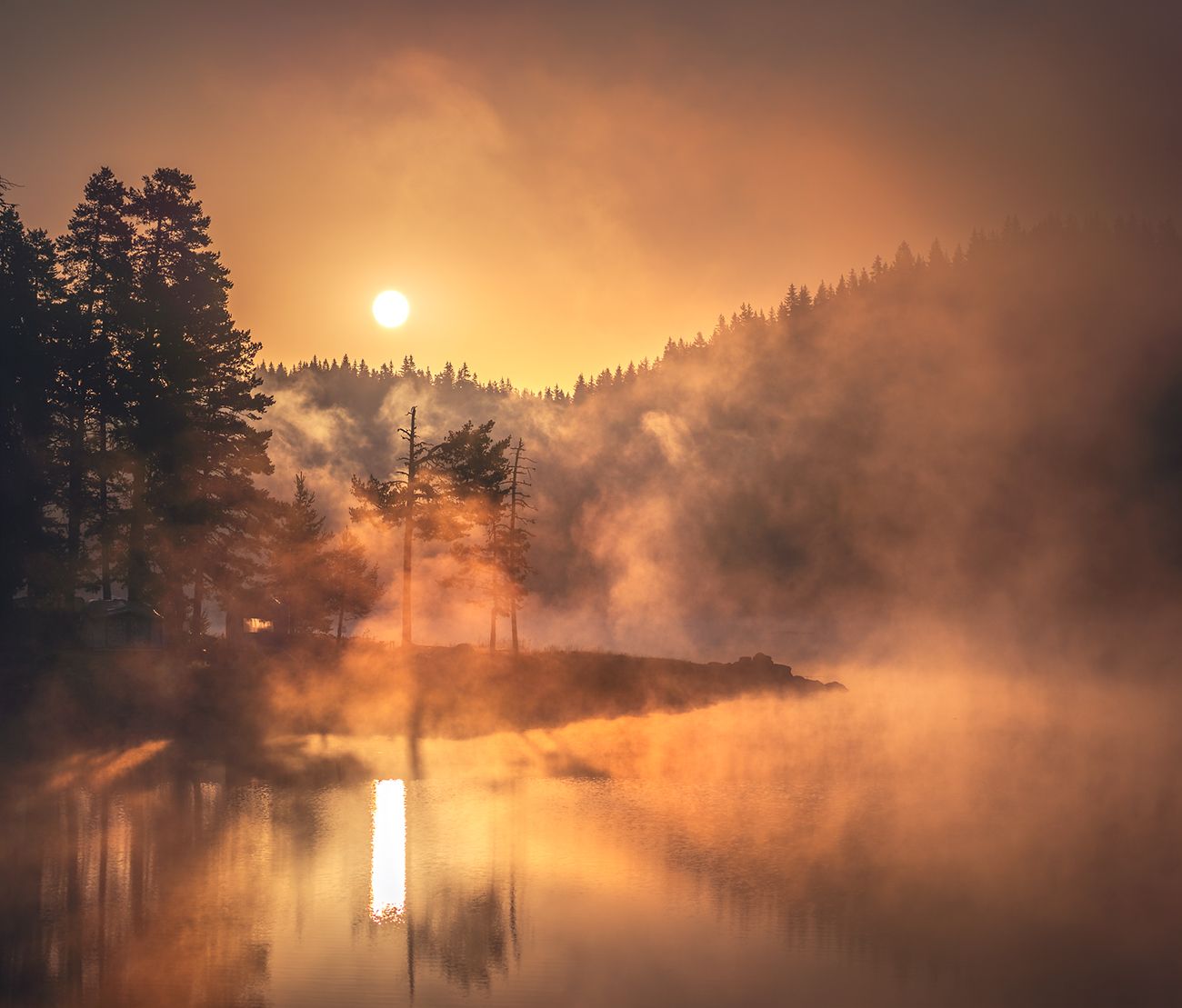 На рассвете над горным озером витает легкий туман, окутывая берега и деревья. Солнце, только что появившееся над хребтом, отражается в воде, создавая золотистый луч. Атмосфера наполнена тишиной и ожиданием. Пейзаж передаёт первые мгновения пробуждения природы — спокойные, волшебные и немного загадочные. Каждый элемент — от тумана до отражения — подчёркивает гармонию утреннего мира.
