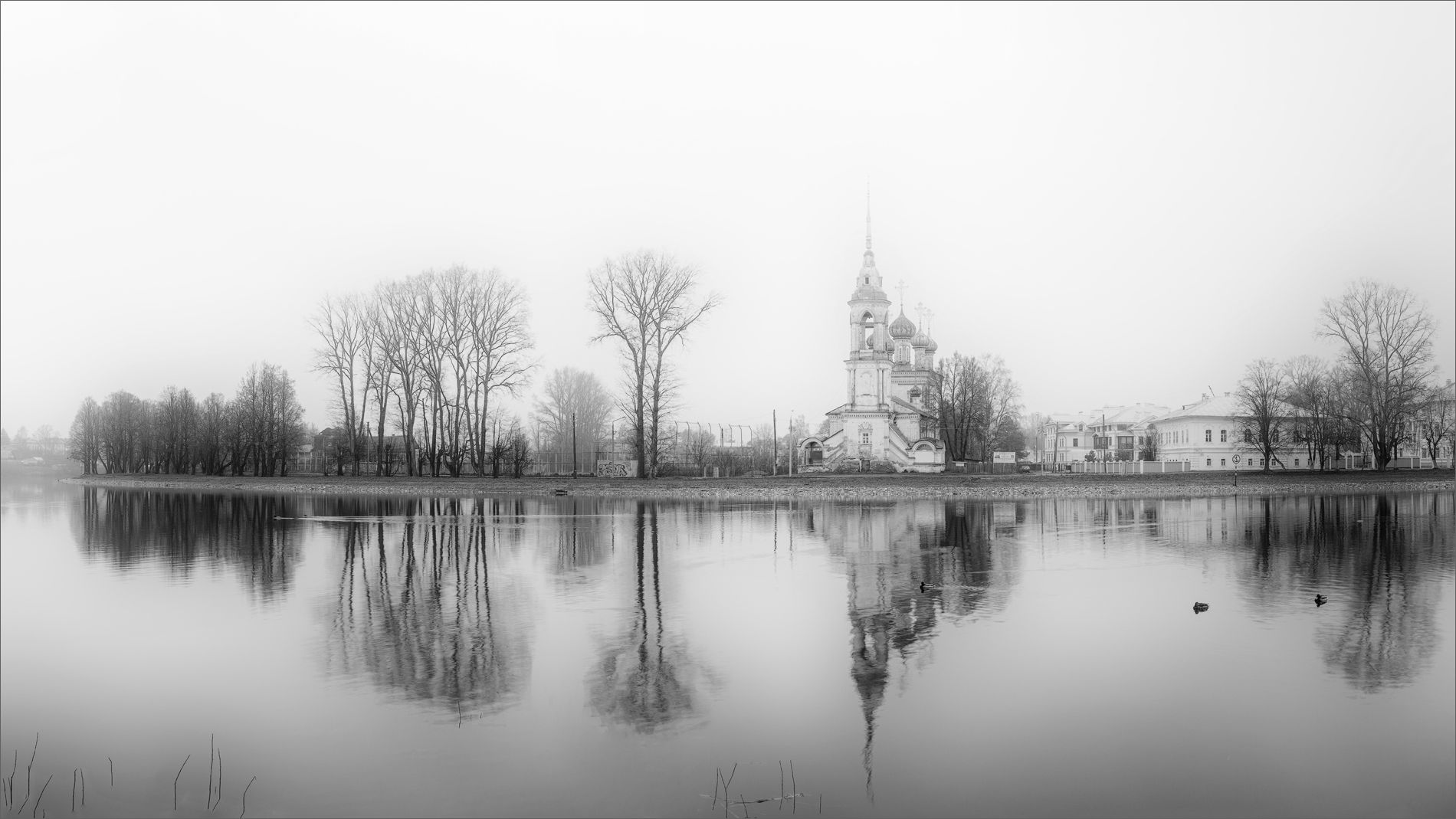 осень, туман, река, церковь, город, отражения, черно-белое, александр никитинский, Никитинский Александр