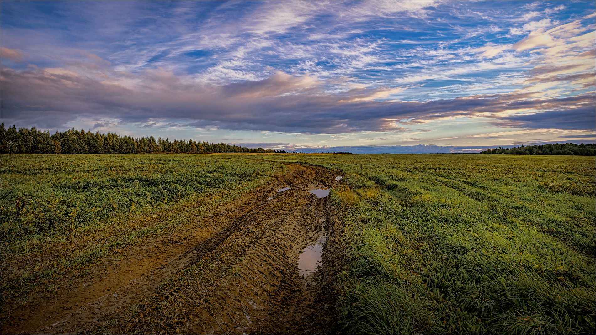 пейзаж, осень, вечер, деревня, поле, небо, свет, цвет, дорога, александр никитинский, Никитинский Александр