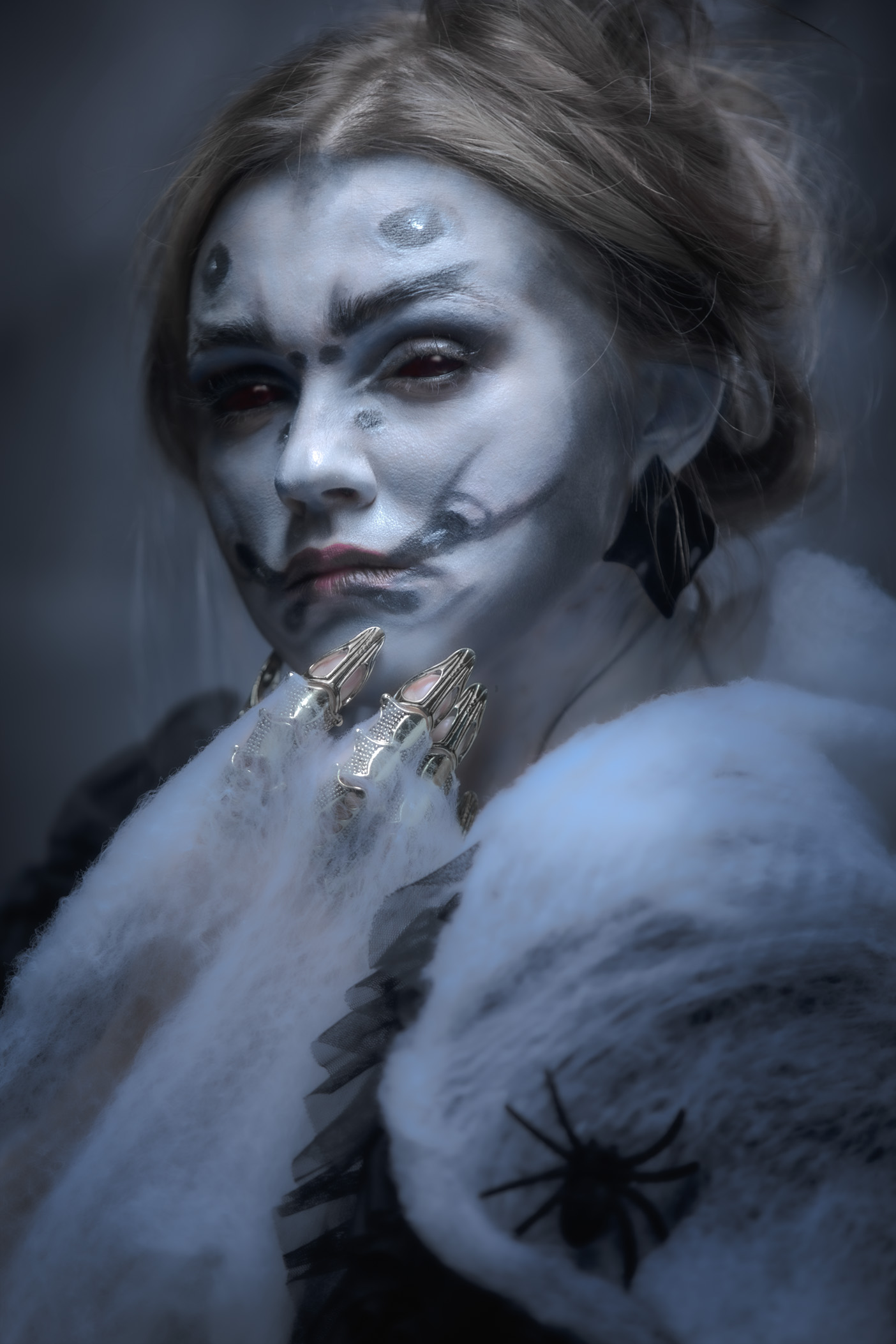 Получилось неплохо. Атмосфера сильная — холод, мистика, акцент на деталях: макияж, кольца, паук на меху. Видно, что продумано. Можно чуть больше света на лице, чтобы выразительность не терялась в тени. Уважаемый Александр, снимок сильный — чувствуется работа.