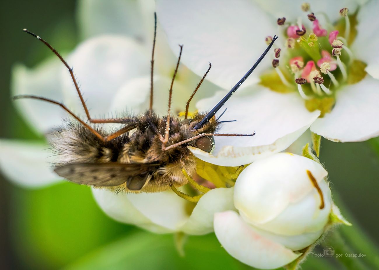 Макро рассказ про муху (Bombylius major). Длинный хоботок мухе жужжало нужен для того, чтобы пить нектар из цветов, она зависает над цветками в воздухе очень похоже как это делают бабочки-бражники. Цветочный паук подстерег и мухе наступил быстрый капут. Самки цветочного паука могут менять свою окраску. Требуется от 10 до 25 дней, чтобы переменить цвет с белого на желтый, обратное превращение совершается за 5 - 6 дней.