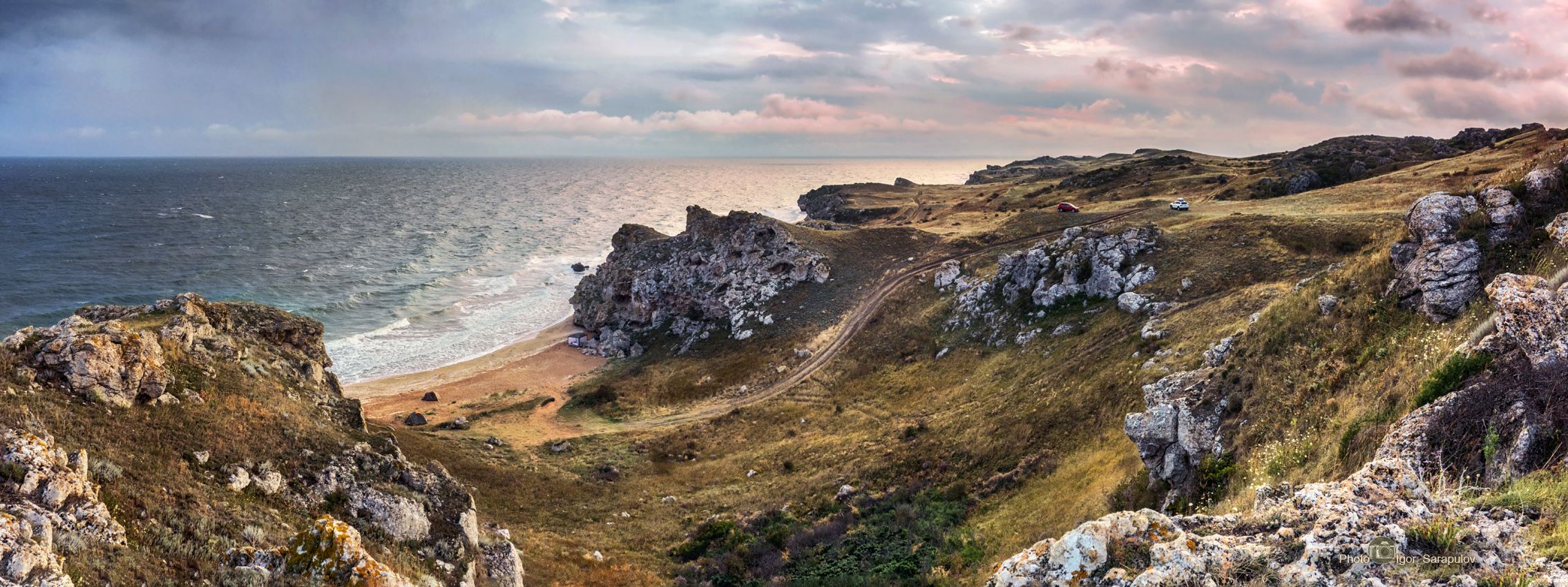 Керченский полуостров, Азовское море, природный парк Караларский, Генеральские пляжи 45.469115, 36.172108 Утро выдалось пасмурным, солнце спряталось за облаками, некоторое время накрапывал дождик. Это место похоже на приземлившийся летевший полого метеорит в воду, можно снимать какой-нибудь фантастический фильм.