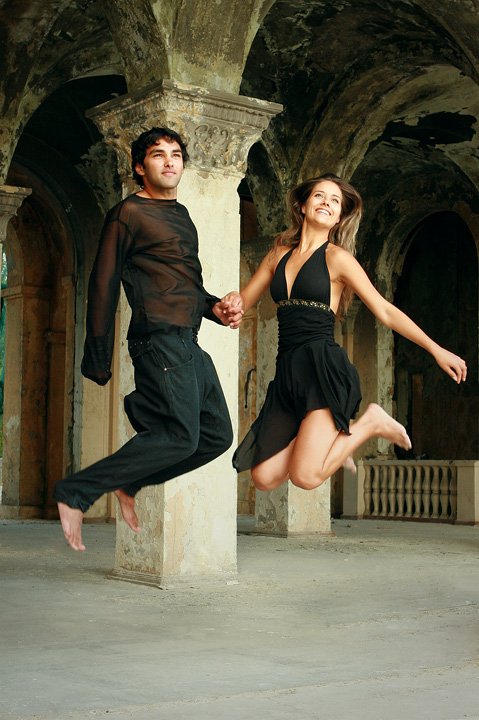 Здорово поймала! именно в момент когда они "подвисли", но ещё не стали опускаться в низ (по волосам девушки видно). Наверно это и делает "невесомость" в кадре.