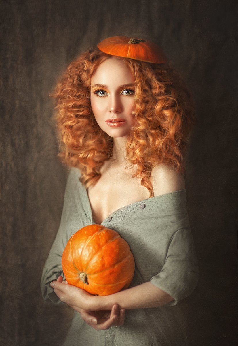 рыжая, рыжая девушка, оранжевый, тыква, тыквы, желтые волосы, рыжие волосы, тыква ,картина, художник, Настя Саврицкая