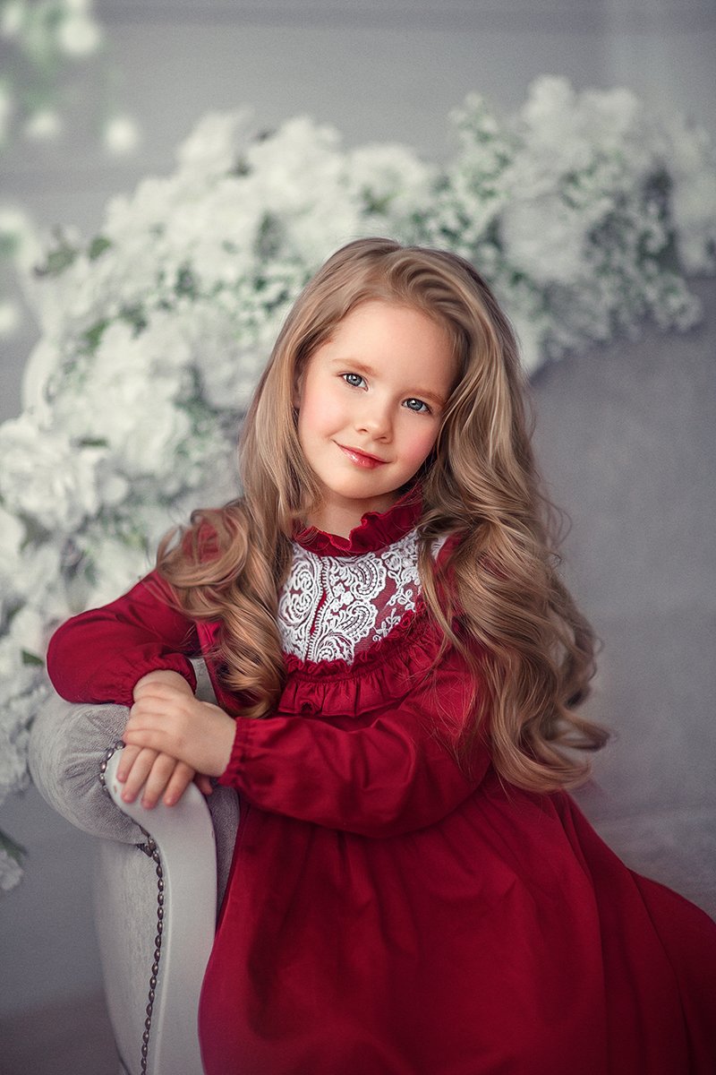 детский портрет, девочка, дети, красное платье, весна , цветы, Настя Саврицкая