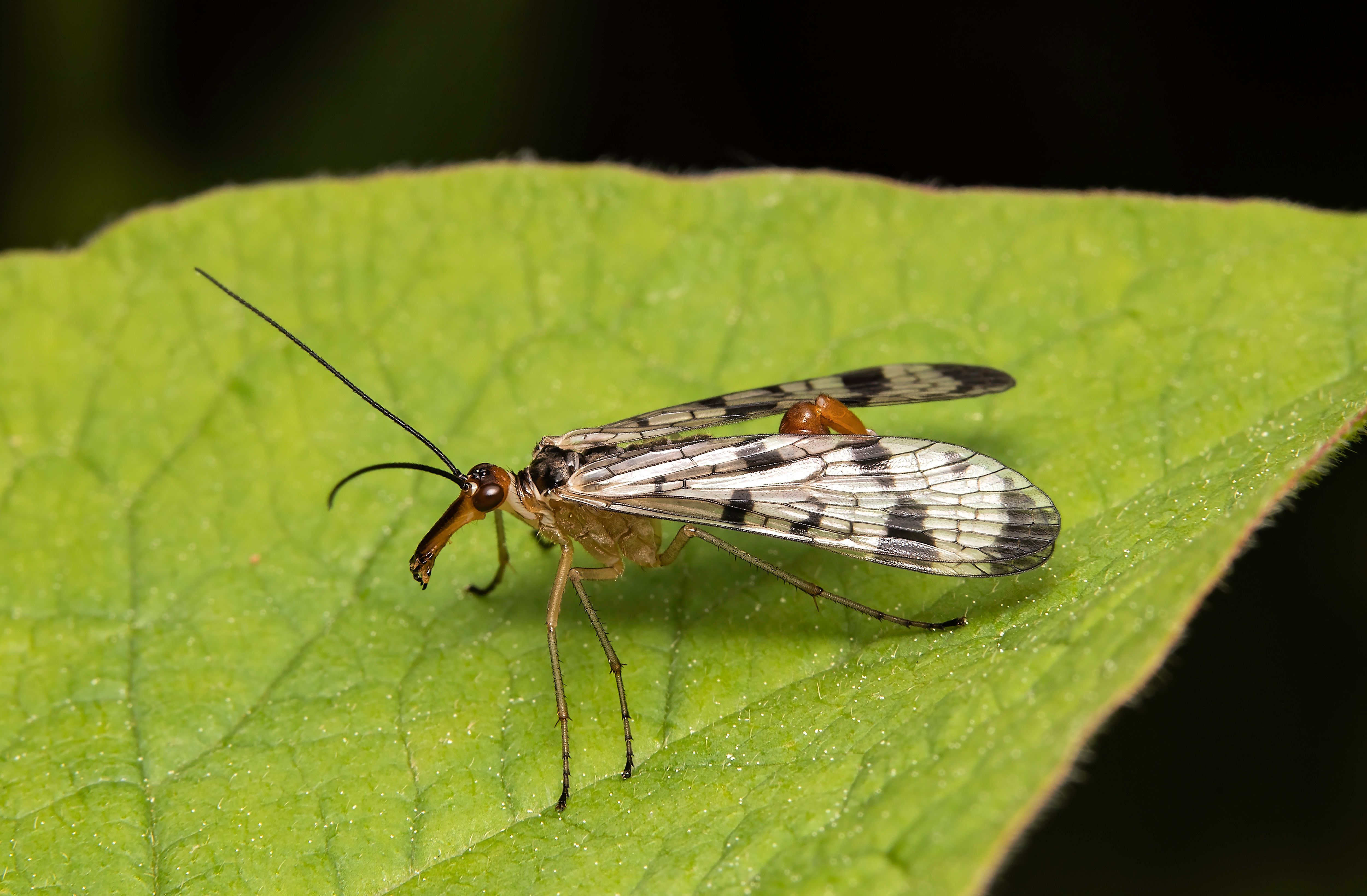 Scorpion flies are carnivorous insects that feed on other insects, especially flies. They do not hesitate to steal food stored on spider webs or to feed on small dead animals.