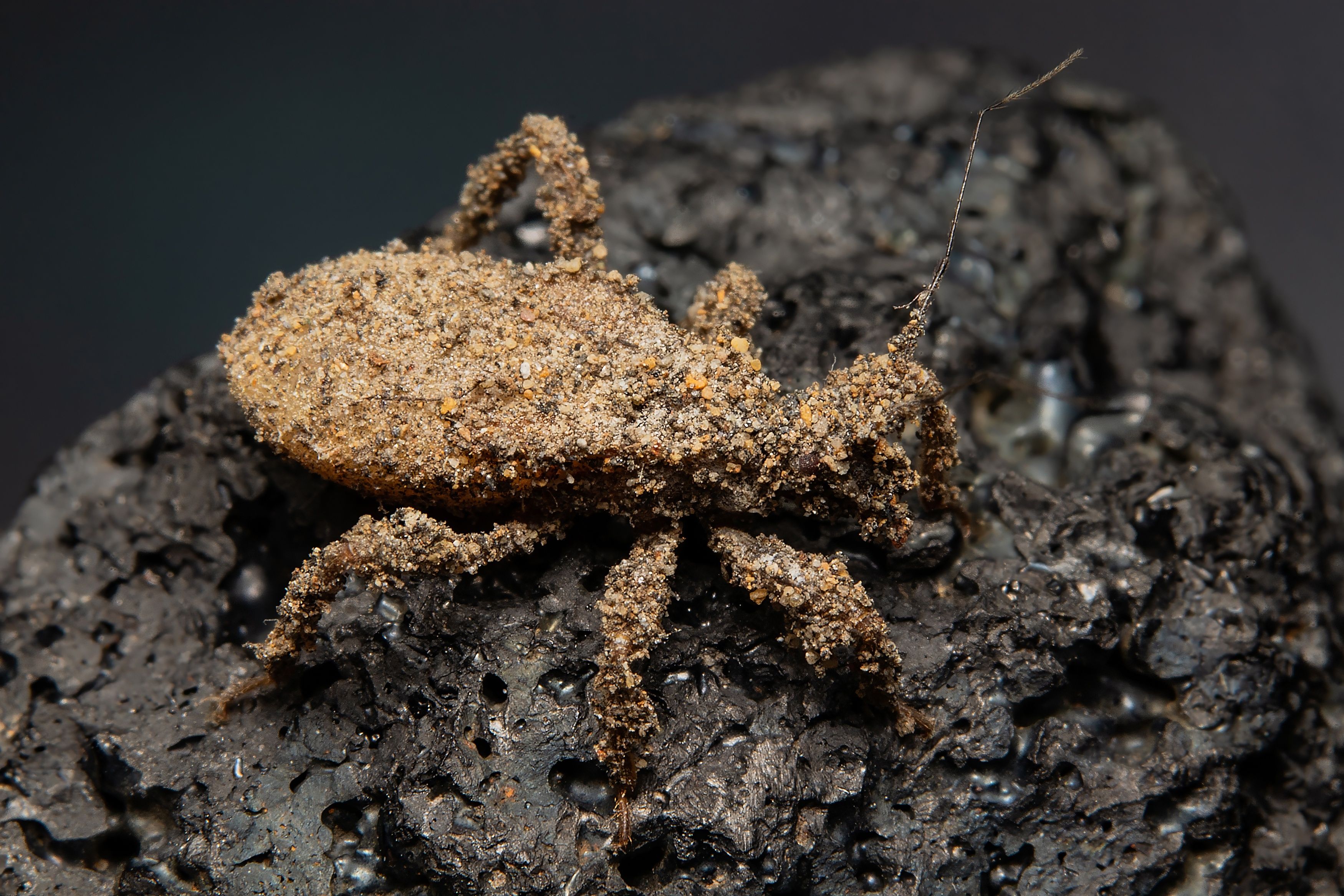 This bug is particularly "dirty". To create their camouflage, masked reduva larvae secrete an oily, sticky substance (a secretion from their integument), which traps dust and other debris. The larva loses this camouflage during moulting, but replenishes it by covering itself by covering itself in dust with its hind legs.
