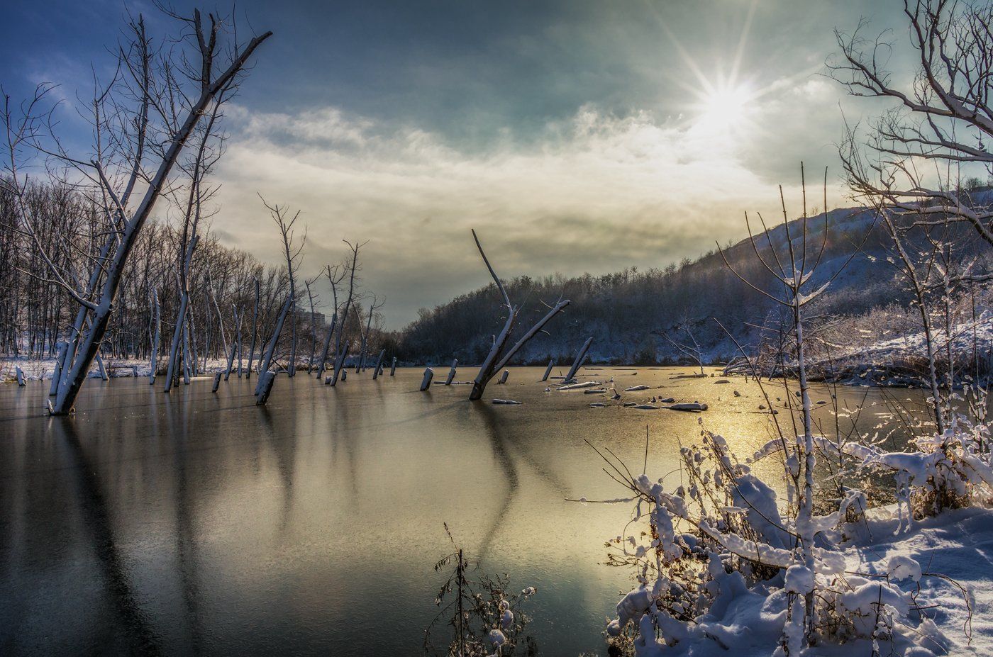 когда-то был ручей, потом зачем-то сделали насыпь, получился такой водоем, вода затопила деревья, они постепенно засохли и теперь падают в воду второй год...