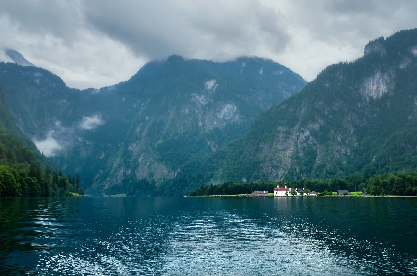Королевское озеро Кёнигзее,близ Берхтесгадена, Верхняя Бавария.Виднеется церковь Св. Бартоломео.
