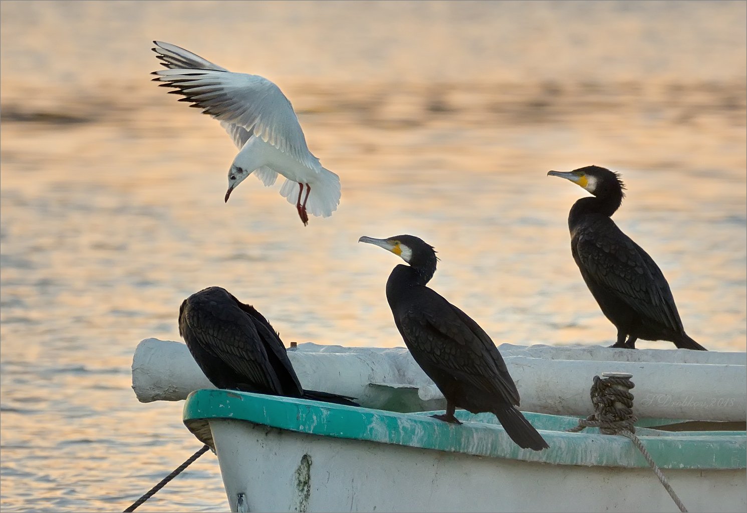 чайка, баклан, лодка, озеро, закат, фауна, Sergey Drobkov