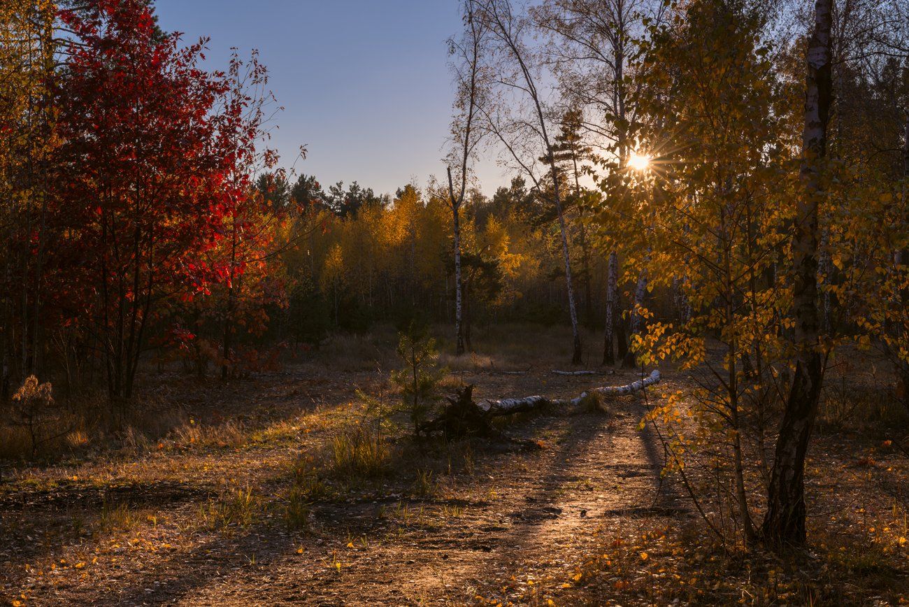 лес, осень, октябрь, закат, солнце, лучи, берёза, дубы, Галанзовская Оксана