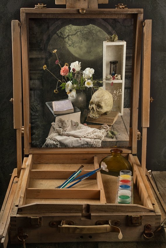 Считаю, не заслуженно не оцененный Ванитас. Может быть как вариант подрезать снизу до белой красочки, либо сверху по цветы. А так два центра получает и рисунок и ящик. С уважением Евгений.