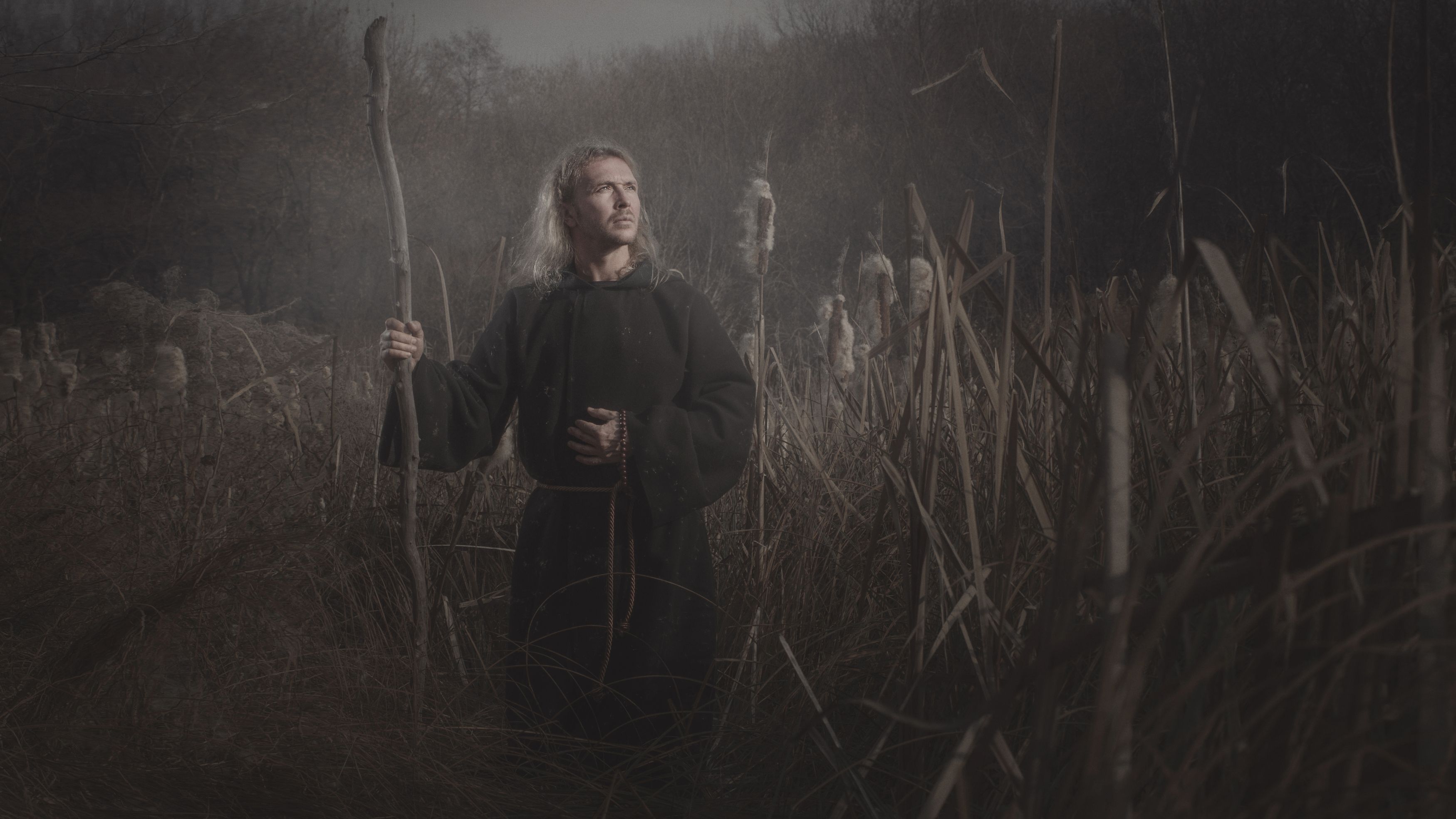 Вы снова погружаете в атмосферу, где свет и тень строят почти ритуальный образ — узнаваемый по вашему подходу к тону и настроению. Фигура в поле, с посохом, — как символ, возвышающийся над сухой землёй, словно в ожидании или призыве. Свет мягко обводит лицо, не разрушая мрачной гармонии, что характерно для вашего стиля.