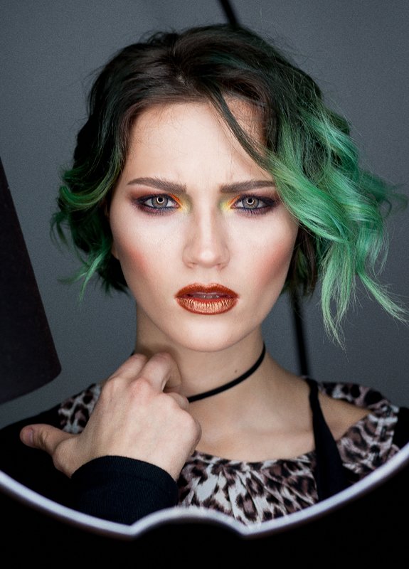 сильный блик на носу и кольцевая вспышка очень резка и неудачное расположение правой кисти модели...цвет волос..-какая-то какафония всего.- мое мнение.