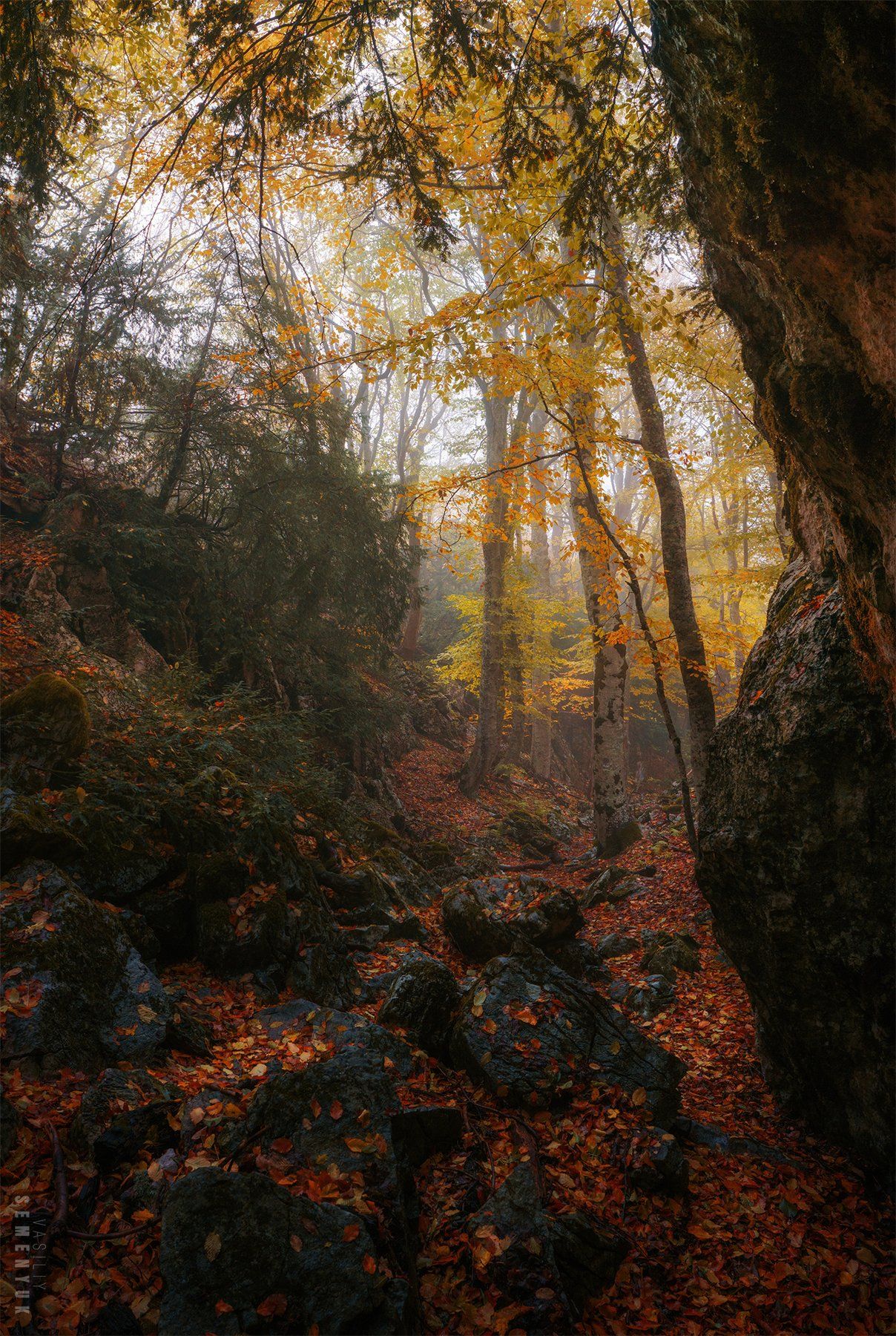 крым, чатыр-даг, тисовое ущелье, осень, лес, камни, туман, панорама., Семенюк Василий