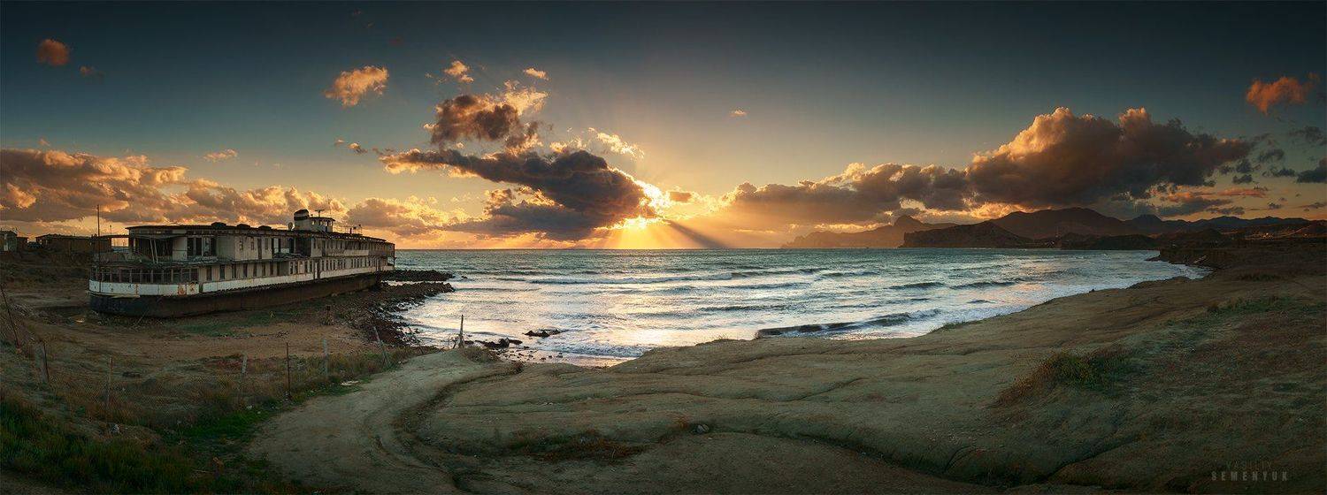 крымсудакмеганомгорытеплоходморезакатосеньфототуроблакалучи светаsunraywreckblack seaseacloudsmeganommountaincoast.