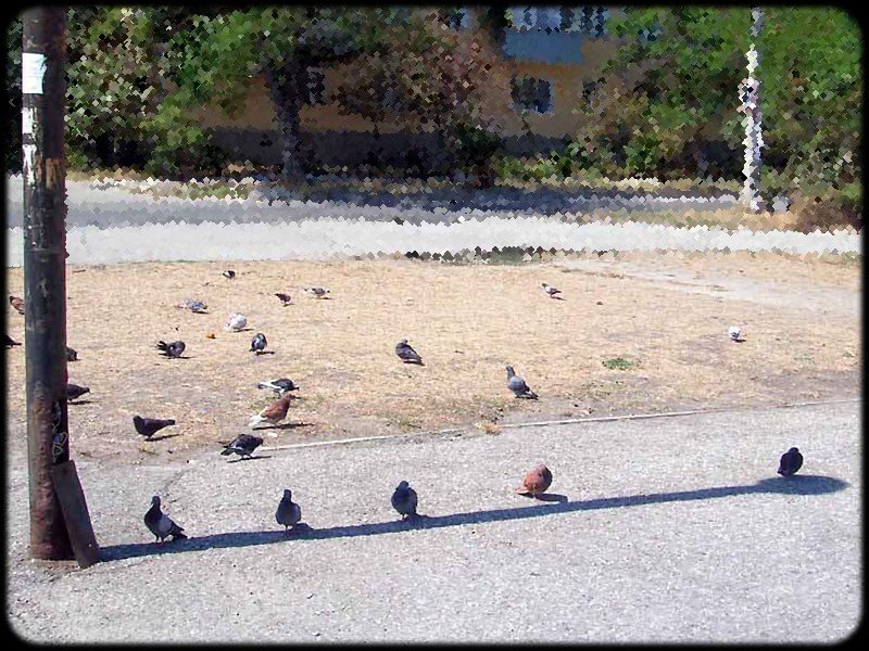 Августовский день в Новороссийске, жара за 30 с копейками. Изначально в тени столба сидело 6 голубей, трое улетели, затем 1 на моих глазах пришел в тень, а второй не дошел.