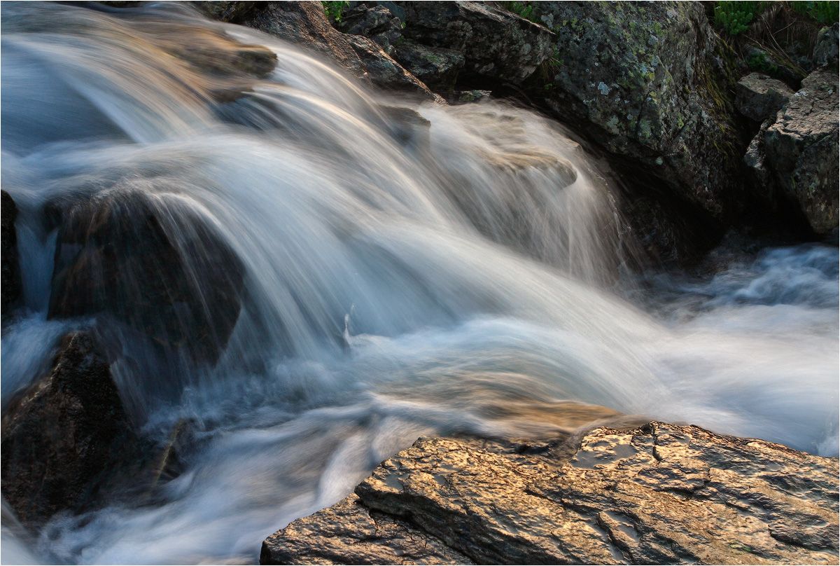 маленький водопадик на ручье, который начинается под перевалом Малого Зуба и впадает в реку Бель-су. Любимый момент отражения закатного света в воде и на мокрых камнях.