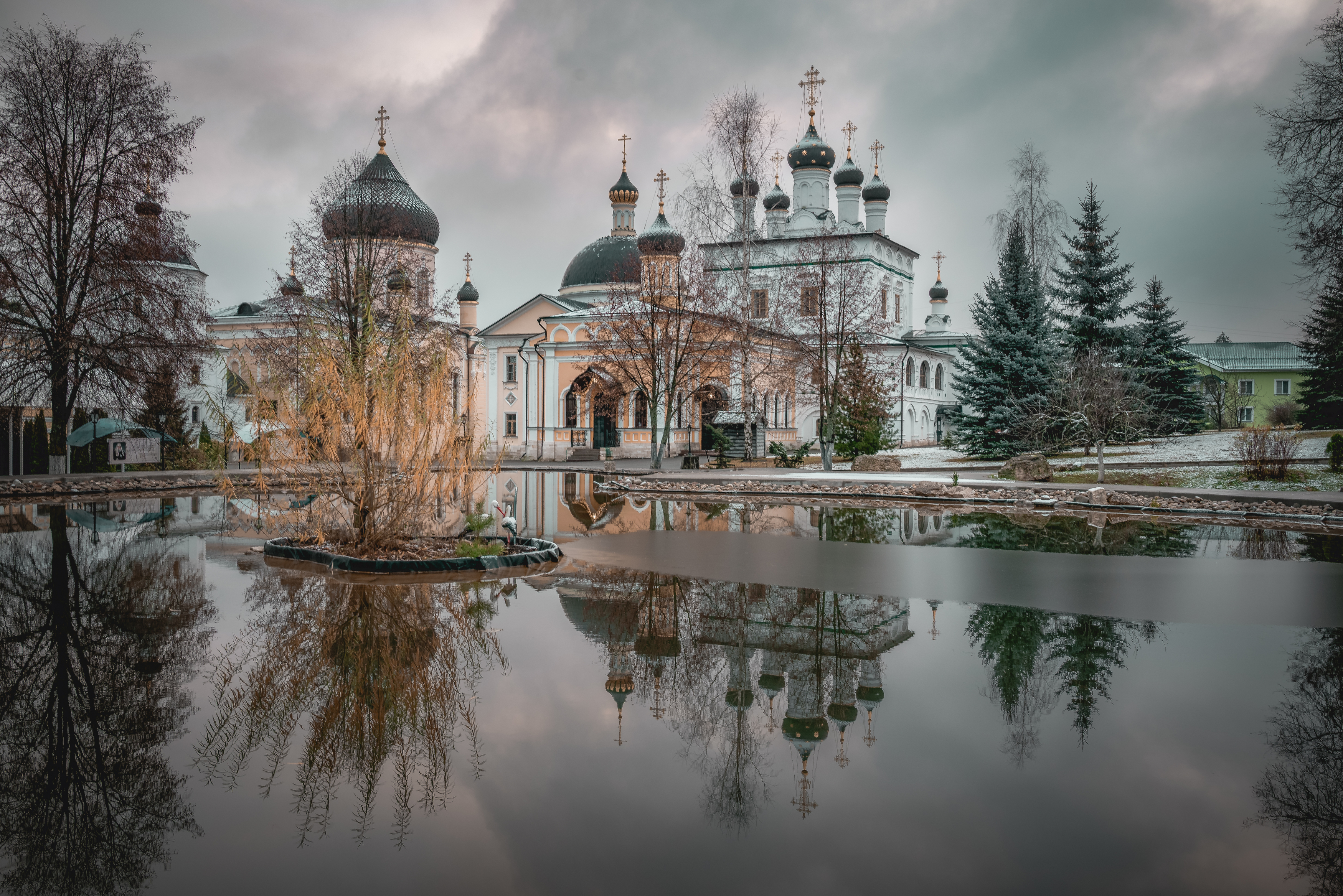 Вы сняли Вознесенскую Давидову пустынь в пасмурный день — здания отражаются в воде, создавая симметричный, почти зеркальный эффект. Композиция сбалансирована, цветовая гамма приглушена, что подчёркивает архитектуру. Можно чуть сильнее выделить детали куполов, но в целом — удачная работа.