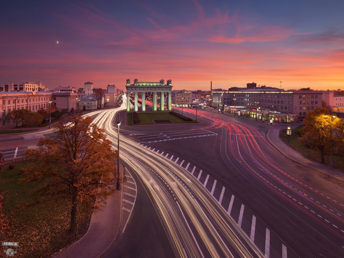 панорама из двух горизонтальных кадров, композитное изображение - небо снято примерно за 15 минут до включения городского освещения, дубли для лучшей прорисовки треков от автомобилей, ретушь проводов и рекламных щитов, фильтр нд16, 17мм, кадрирование