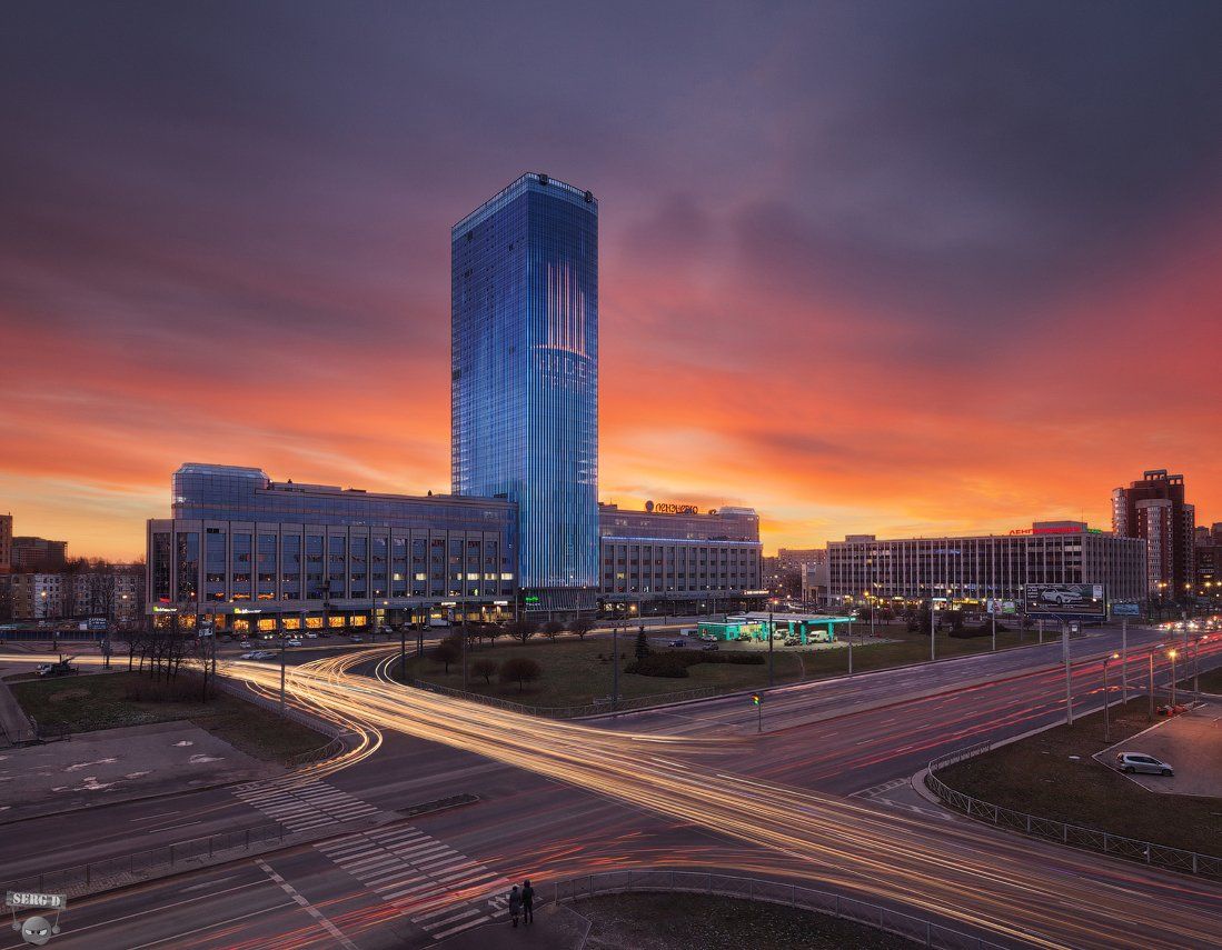 панорама из двух горизонтальных кадров на 20мм, композитное изображение - небо и основа сняты примерно за 10 минут до включения городского освещения, дубли для нужных трассеров, для разгорающейся подсветки и устранения пересветов, также дополнительные кадры с вариантами подсветки фасада башни, всего использовано около 35 кадров, много ретуши мусора