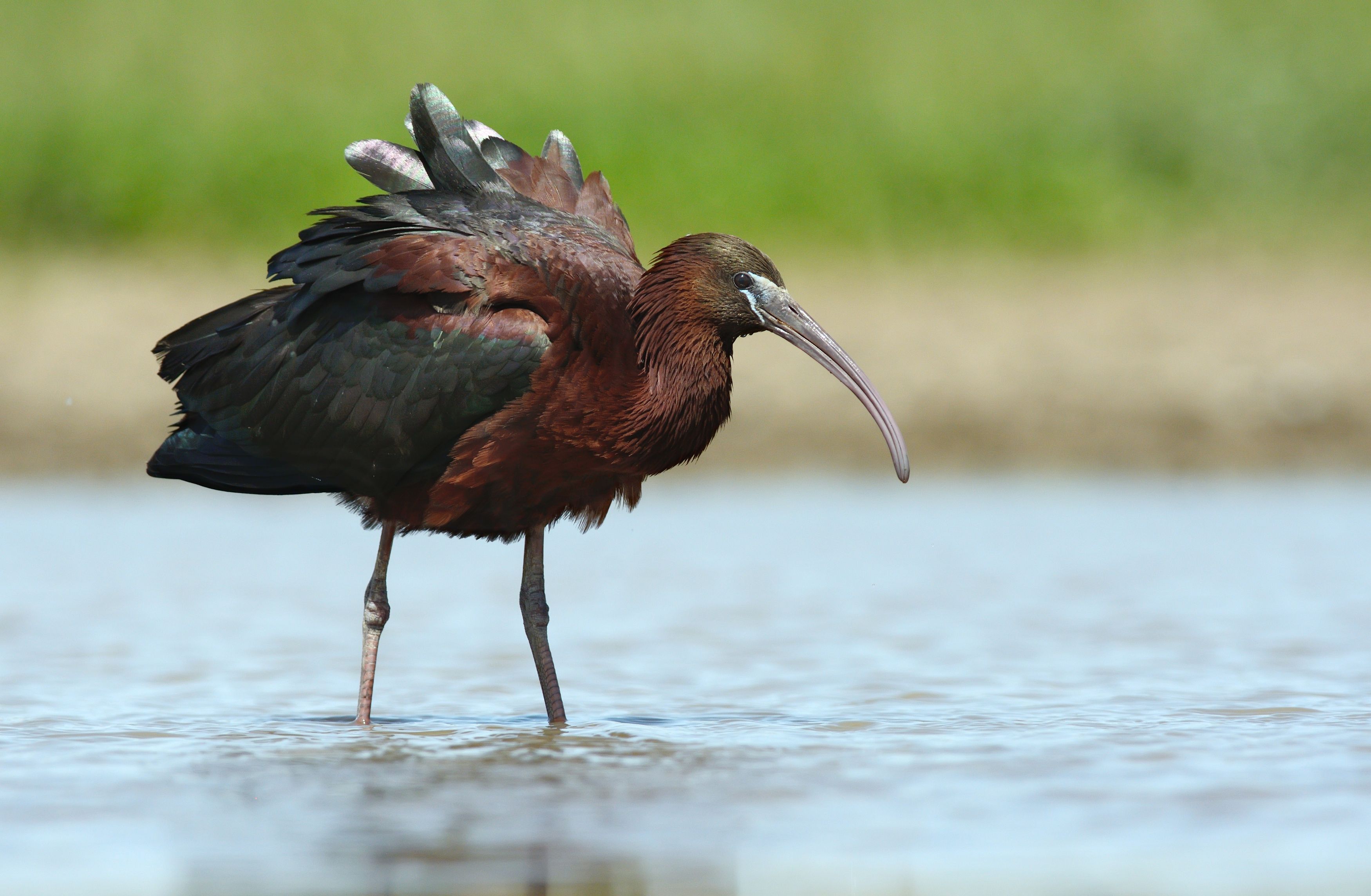 На снимке — каравайка, стоящая в воде и расправившая крылья, вероятно, для охлаждения или высыхания перьев. Птица с характерным изогнутым клювом и коричнево-чёрным оперением. Фон — прибрежная зона с зелёной растительностью. Фотография передаёт естественное поведение птицы в её среде обитания. Фото: Сергей Шкарупо.
