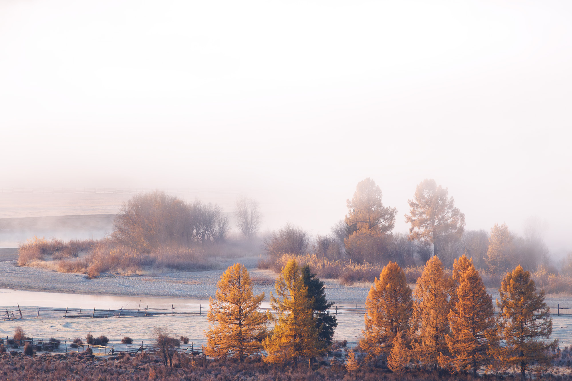 В тишине раннего утра Джазатор окутан туманом, словно в сказке. Лиственницы, залитые золотистым светом, выступают из белесой дымки, а снег на земле хранит следы ночи. Это место, где время замедляется — и каждый вдох наполнен ароматом хвои и холодом чистого воздуха. Горный Алтай вновь раскрывает свою дикую, но умиротворяющую красоту.