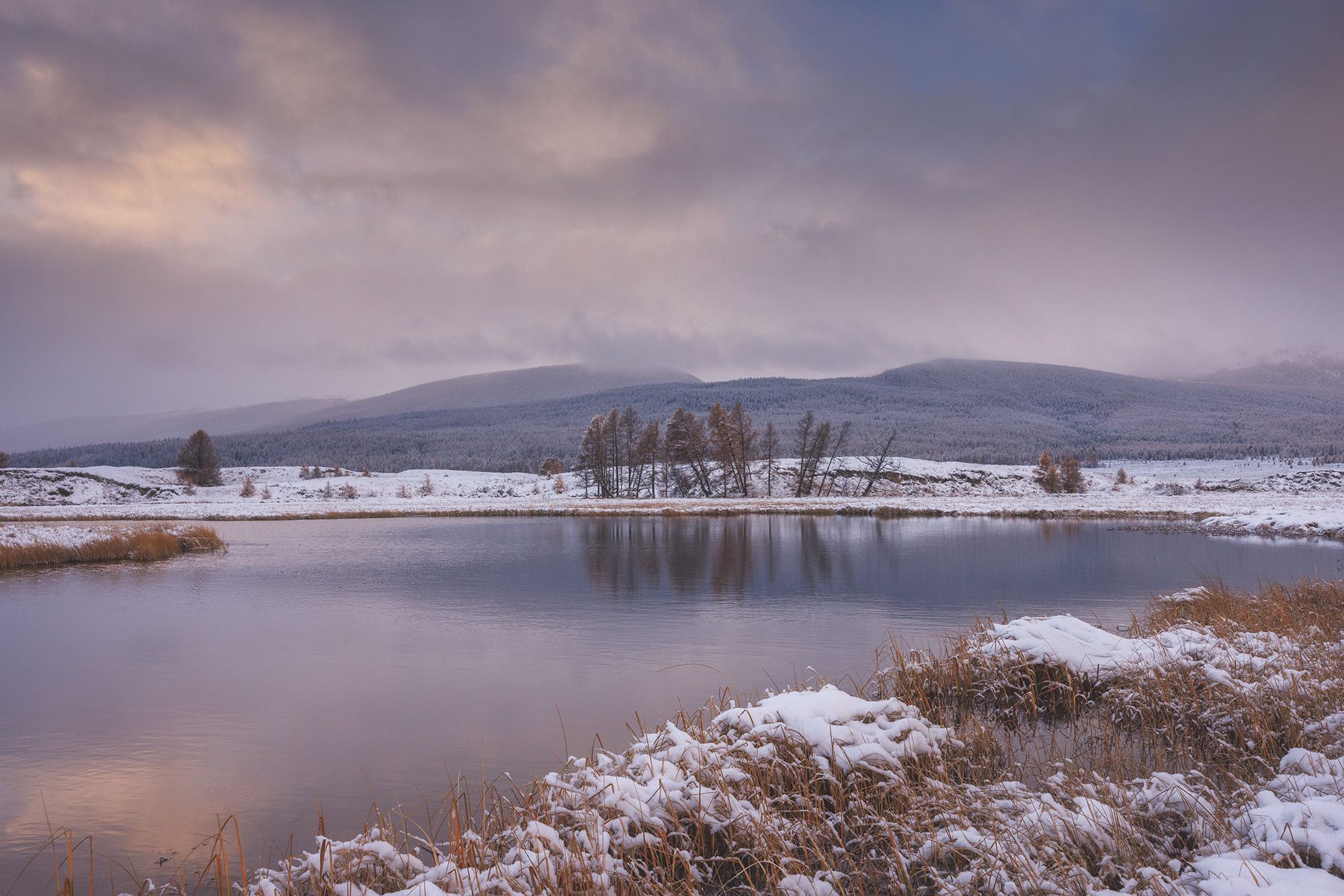 Погода классная на фото! Такая грустно-зимняя настроенческая. Первый снег, пасмурно, видно ночью был снегопад. На небе низкие синие тучи, но через просветы видны жёлтенькие облачка. Возможно скоро погода разгуляется, а может и нет... Очень красивое состояние природы снято!