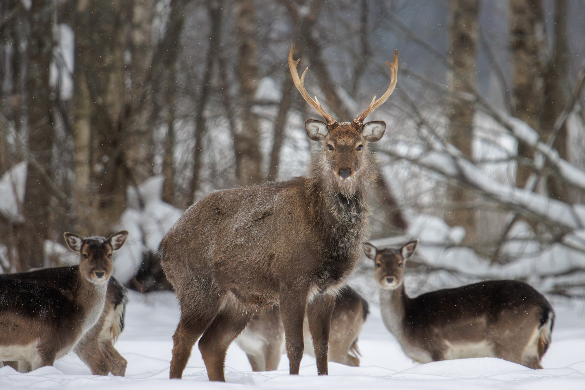 Сергей, фотография передаёт спокойную силу зимнего леса — олень с рогами в центре, как страж, а вокруг — молодые, внимательные. Снег, деревья, свет — всё в гармонии. 🌲🦌