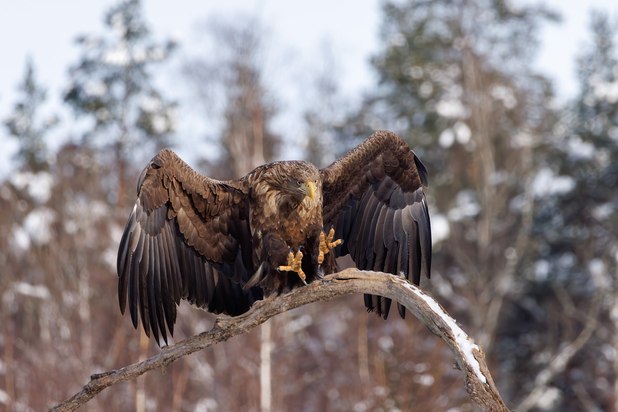 Сергей, какая сила в этом образе — орёл на ветке, расправив крылья, словно готов к взлёту. Хорошо поймали момент, и фон с зимним лесом добавляет глубины. Впечатляет.