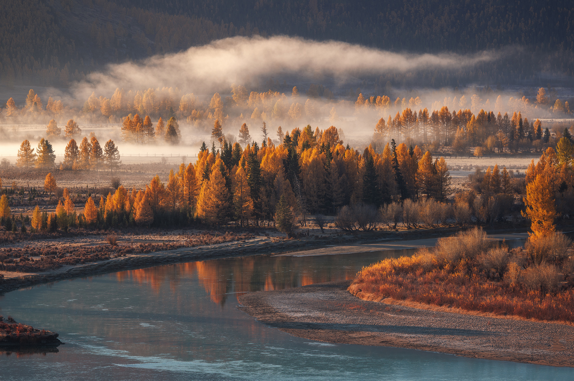 В тишине раннего утра над рекой Джазатор в Горном Алтае поднимается туман, окутывая леса и холмы. Золотистые лиственницы отражаются в воде, словно в зеркале, а свет рассвета пронизывает облака, создавая волшебный световой эффект. Каждый вдох здесь — это аромат свежести и чистоты, каждый взгляд — приглашение в мир, где природа дышит ритмом времени.