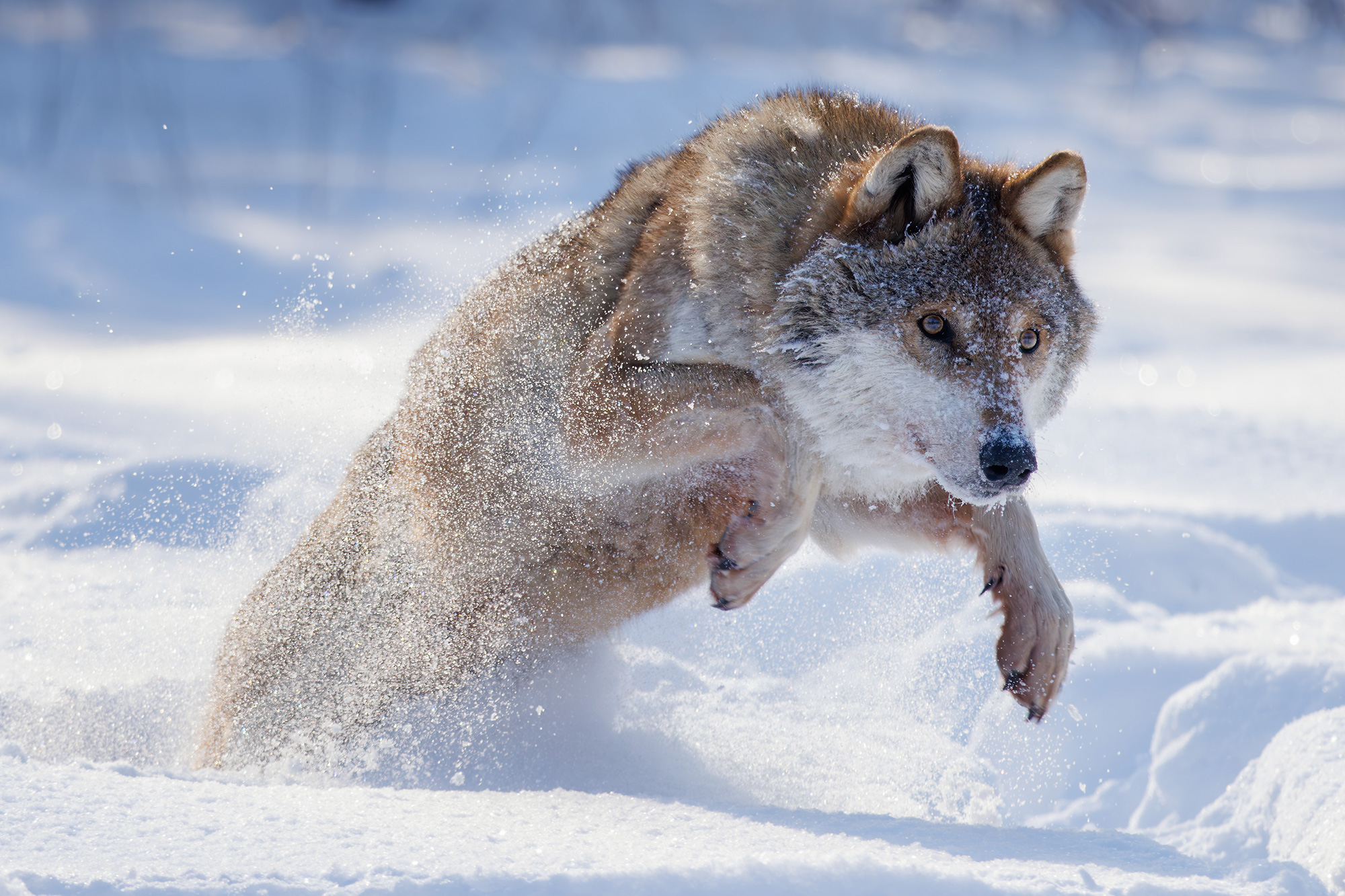 Сергей, в этой снимке волк словно оживает — мощный прыжок в снегу, каждый кристаллик будто замер в воздухе. Движение передано с редкой чёткостью, а свет придаёт сцене почти сказочную ясность.