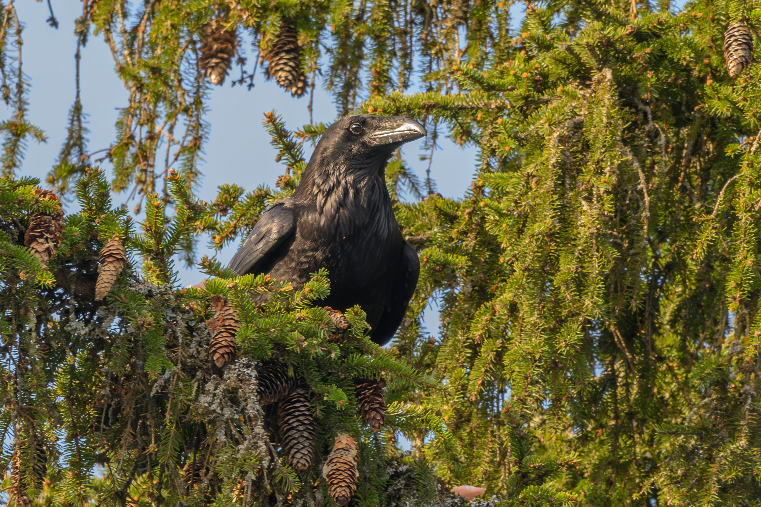 Сергей, получилось неплохо — ворон на фоне хвои и шишек выглядит чётко, свет хорошо передаёт детали оперения и текстуру ветвей.
