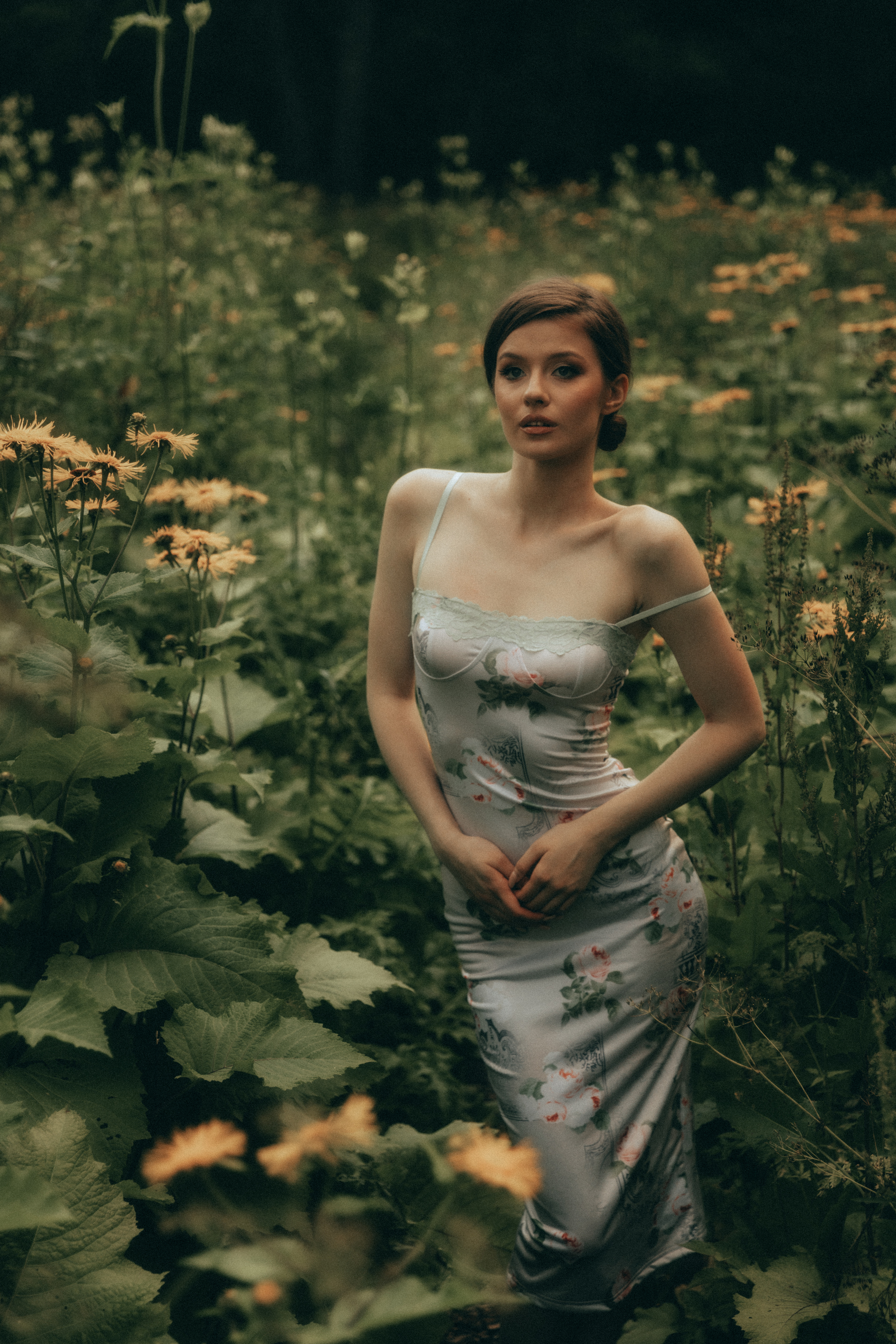 В тихом саду, окутанном зеленью и цветами, девушка в изысканном платье словно выросла из земли. Её взгляд — устремлён вдаль, но не отстранён, а проникновенный, будто она ведёт диалог с природой. Каждый лист, каждый цветок — часть её образа. Фотография Сергея Антонова передаёт не просто сцену, а состояние — умиротворение, красота, сливание с природой. Это не портрет, а мгновение, застывшее в гармонии.