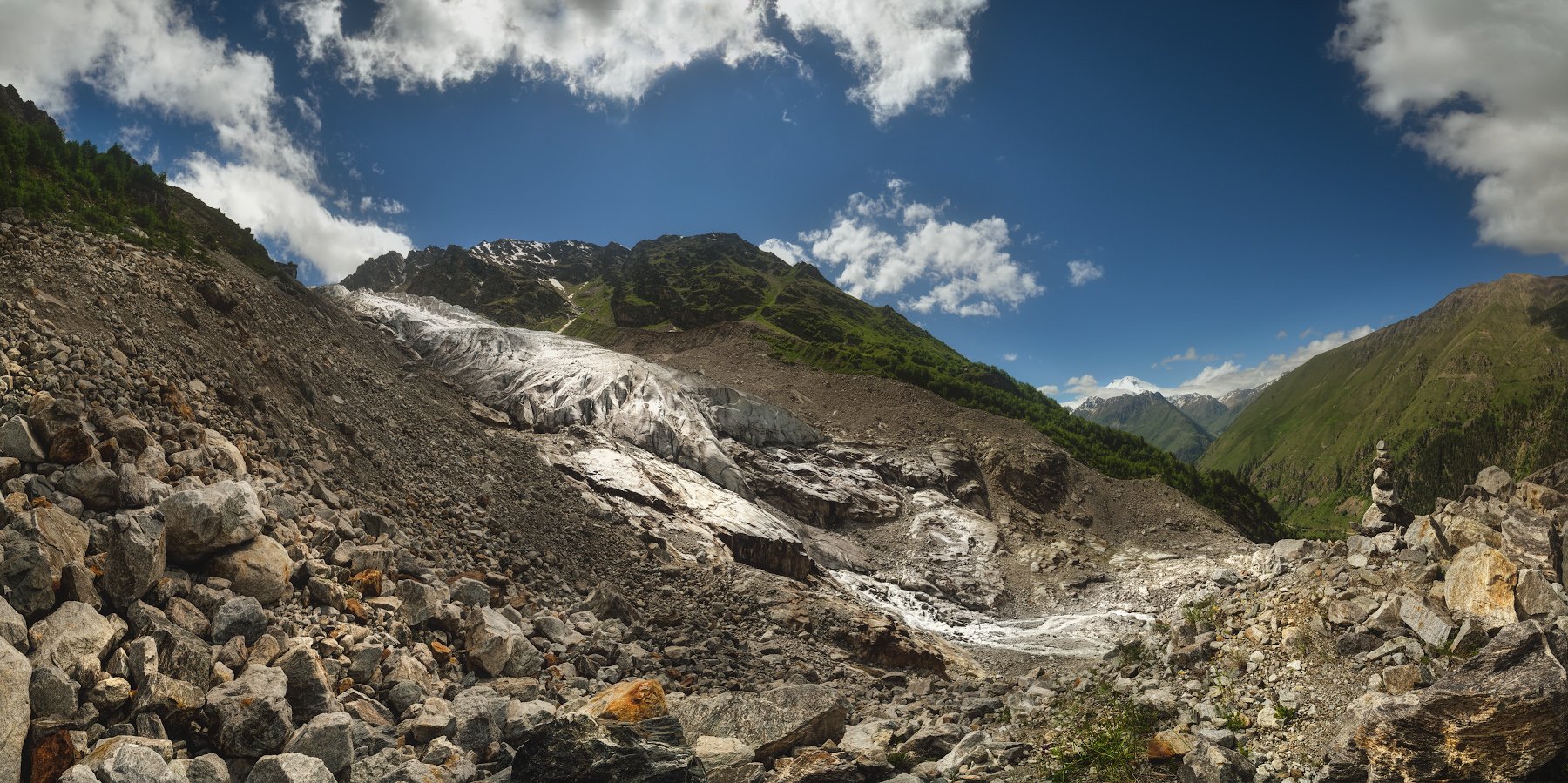 НП "Приэльбрусье". Выход ледника Кашкаташ в ущелье Адылсу. 2600 м. Справа вдали на горизонте виднеется Эльбрус.