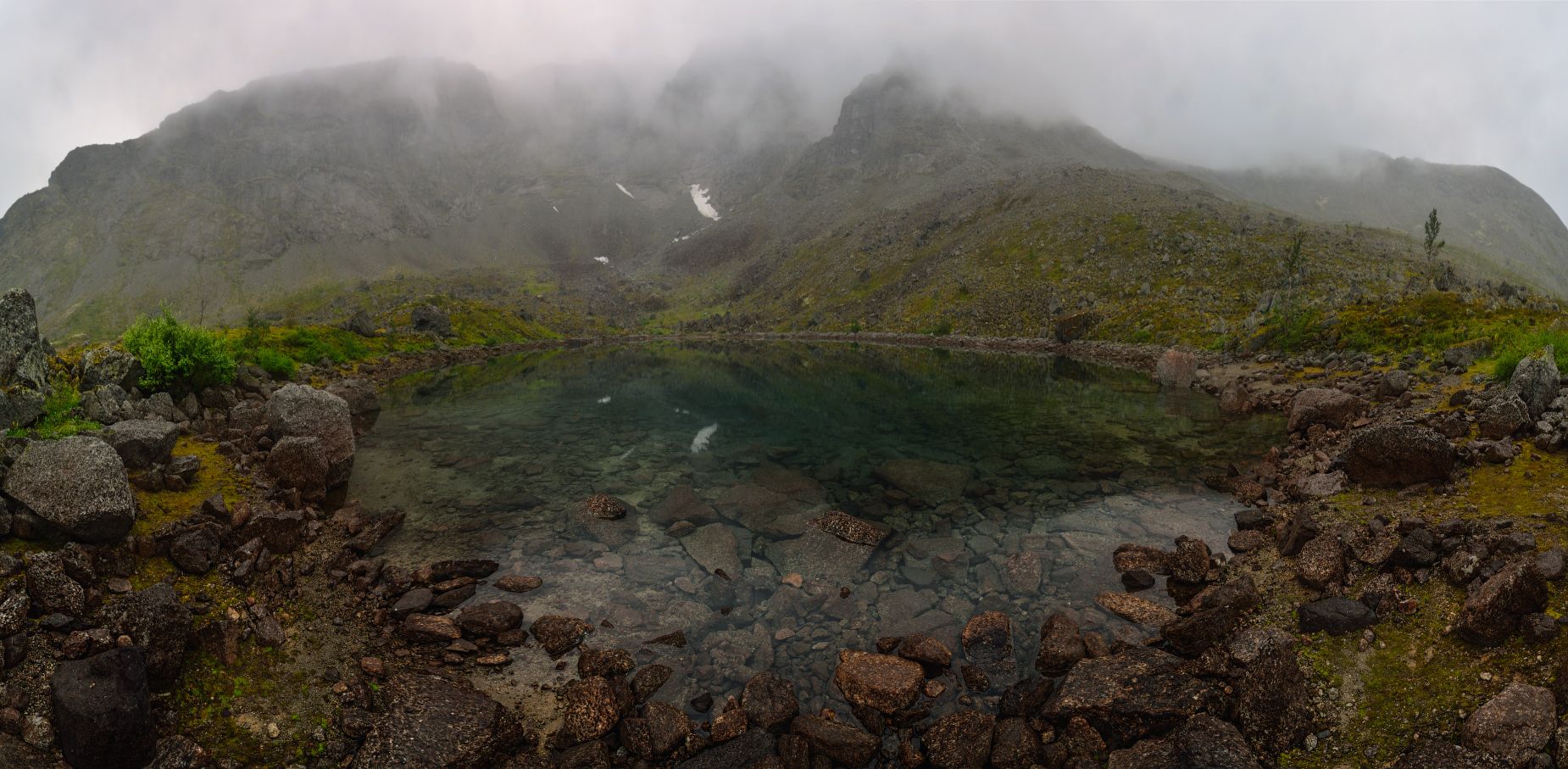 Хибины. Этот горный цирк назван именем Ганешина Сергея Сергеевича, возглавлявшего ботаническое подразделение Кольской экспедиции АН СССР. 30.08.1930 г. в последний день полевой работы он заблудился в тумане на горе Вудъяврчорр (слева). За туманом последовала мощная снежная буря. Смерть наступила от внезапной остановки сердца. Перевал географов (в тумане справа) разделяет массивы Вудъяврчорр и Тахтарвумчорр. У подножья Вудъяврчорра в 1931 г. был основан и ныне работающий Полярно-альпийский ботанический сад институт.