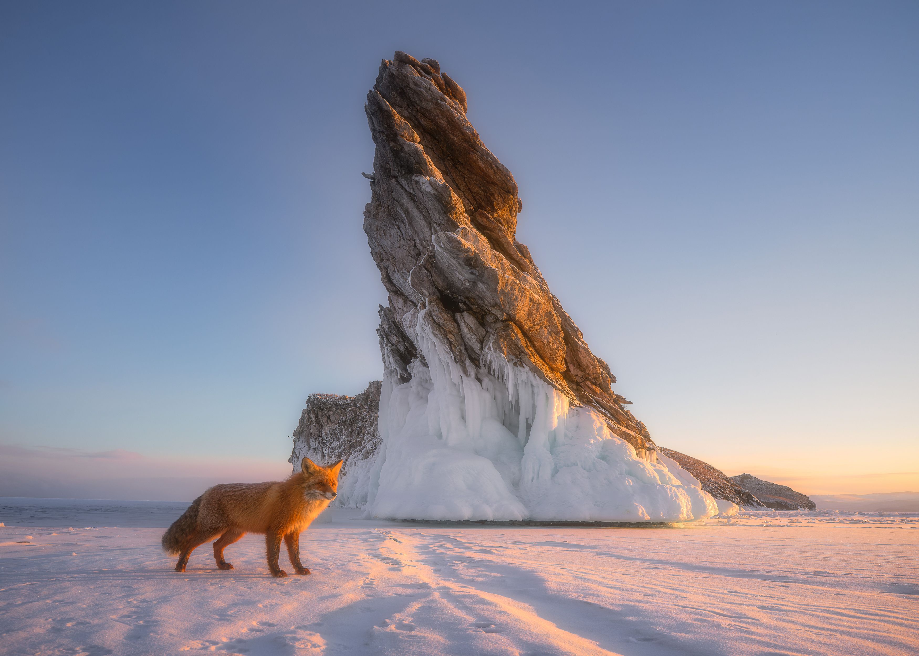 В тишине зимнего утра лиса стоит на краю ледяной равнины, вглядываясь в величественную скалу, обледеневшую и озарённую первыми лучами солнца. Контраст её яркой шерсти и холодного белого льда создаёт визуальную поэму природы. Каждый элемент — от отблесков на льду до тени на камне — говорит о гармонии и одиночестве. Это не просто пейзаж — это момент, застывший в вечности.