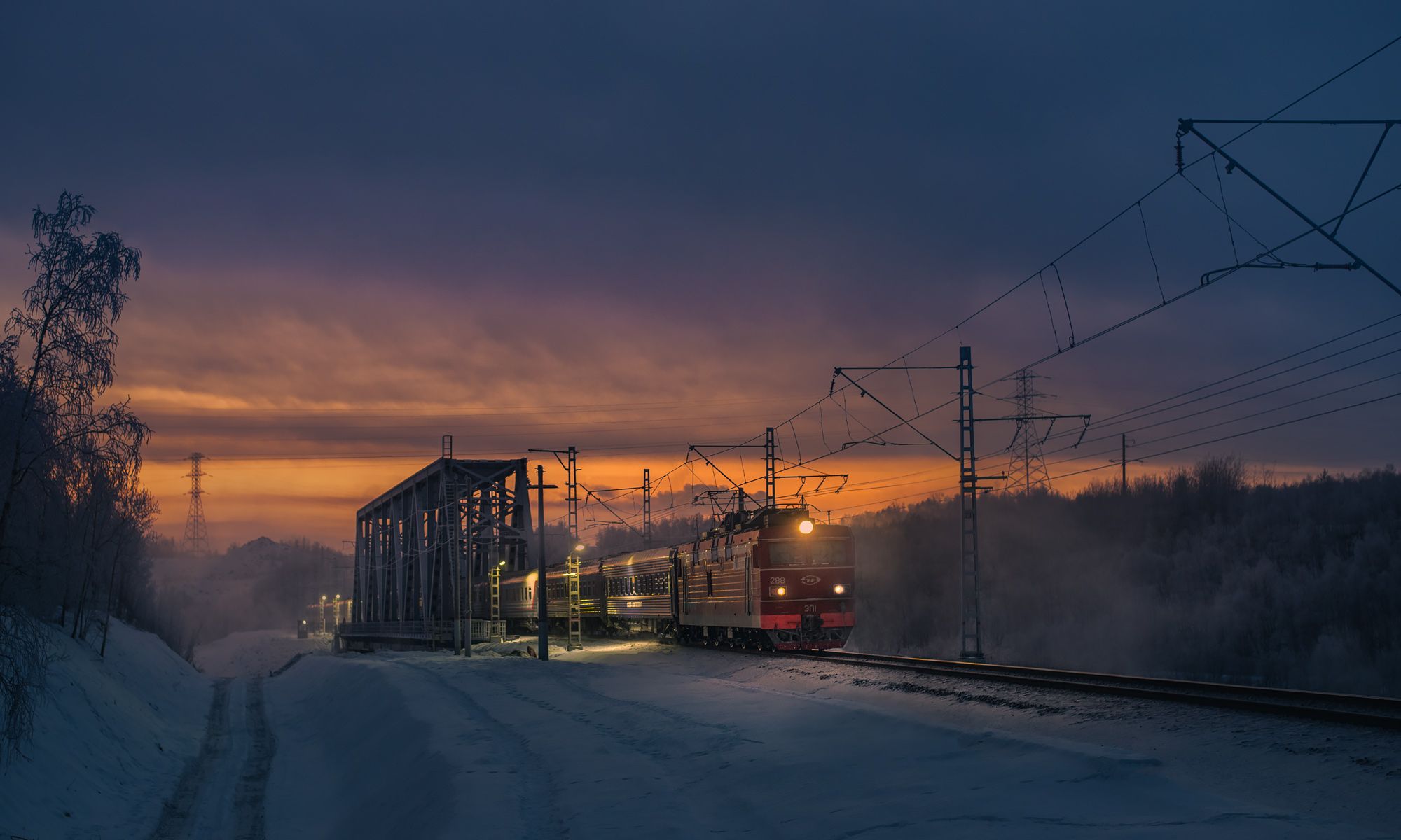 Идея этого кадра родилась спонтанно во время прогулки к новому железнодорожному мосту через Колу. Весенний паводок 2020-го года обрушил действующую на тот момент переправу. Прямое сообщение с Мурманском было парализовано на несколько месяцев. В сентябре того же года движение по новому фермовому мосту было восстановлено. Город получил надёжный путь сообщения с материком, а я пополнил свою коллекцию железнодорожных пейзажей.